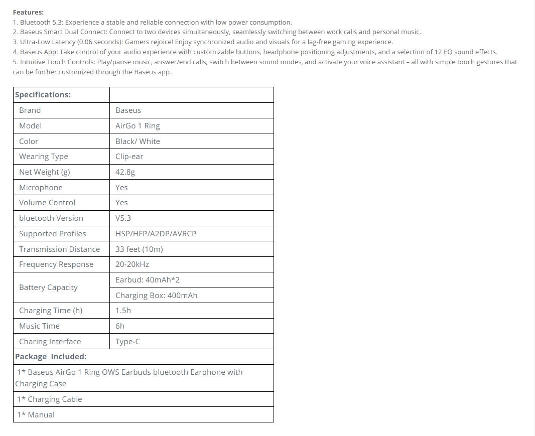 Baseus AirGo 1 Ring OWS Earbuds bluetooth Earphone BISA Audio Quick Charge Dual Channel Low Latency Mini Portable Headphones with Mic
