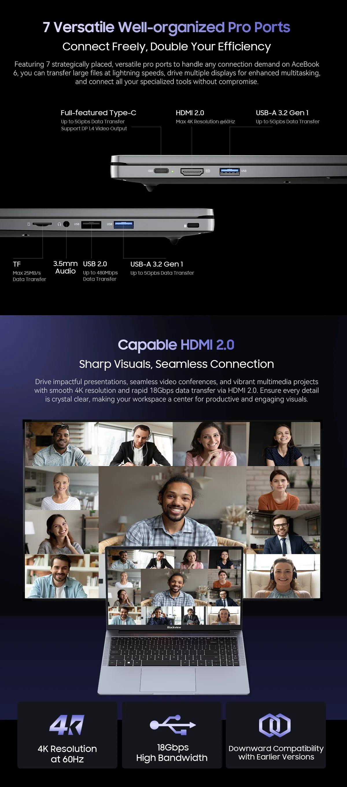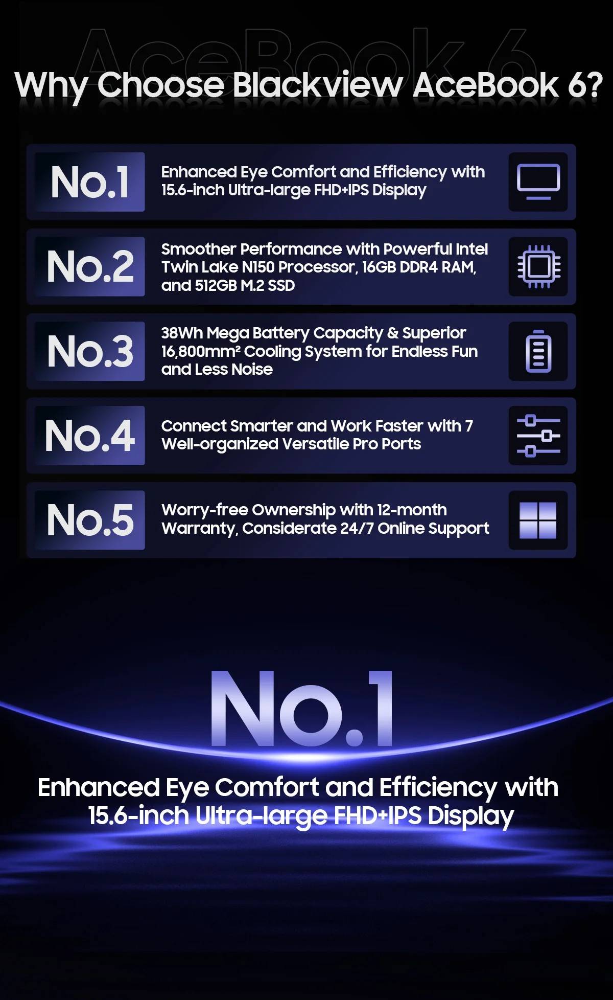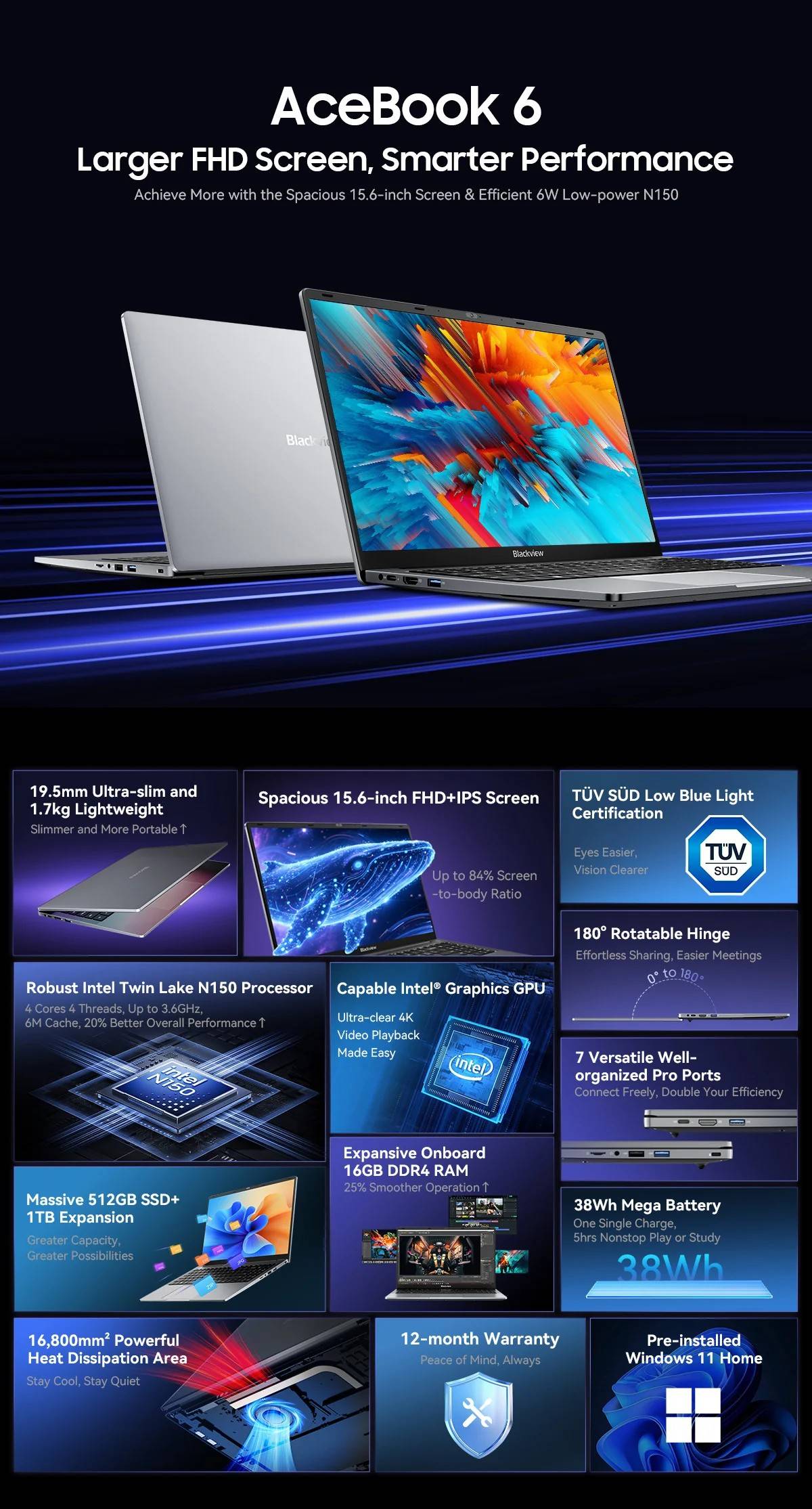 Blackview AceBook 6 Laptop 15.6'' FHD+ IPS Screen Intel Twin Lake N150 CPU 16GB DDR4 512GB SSD 36Wh Battery Windows 11 Notebook