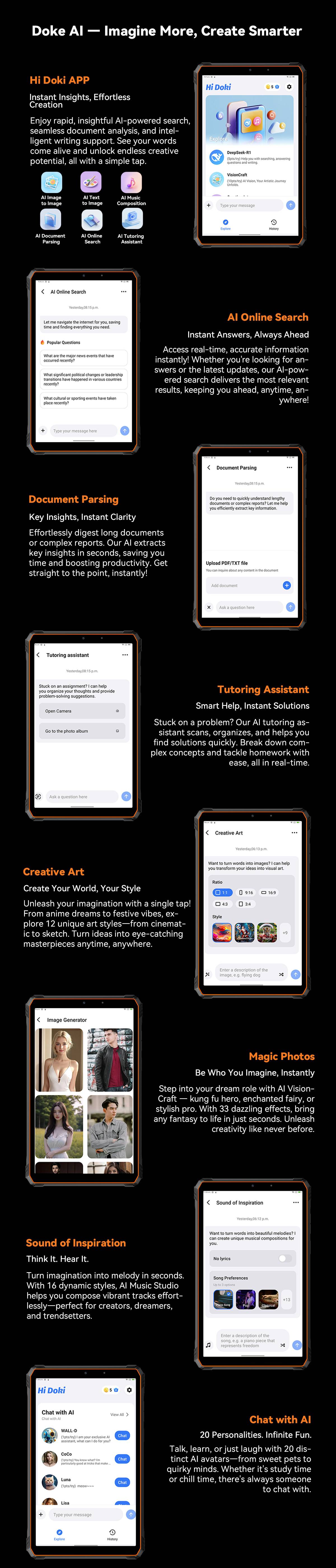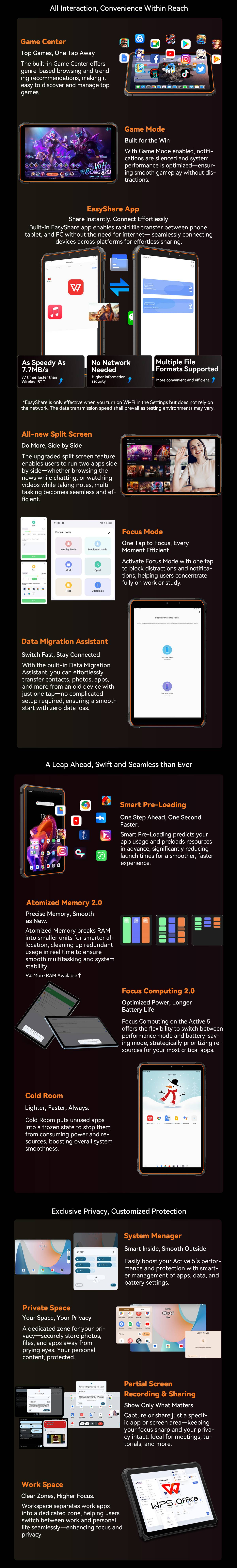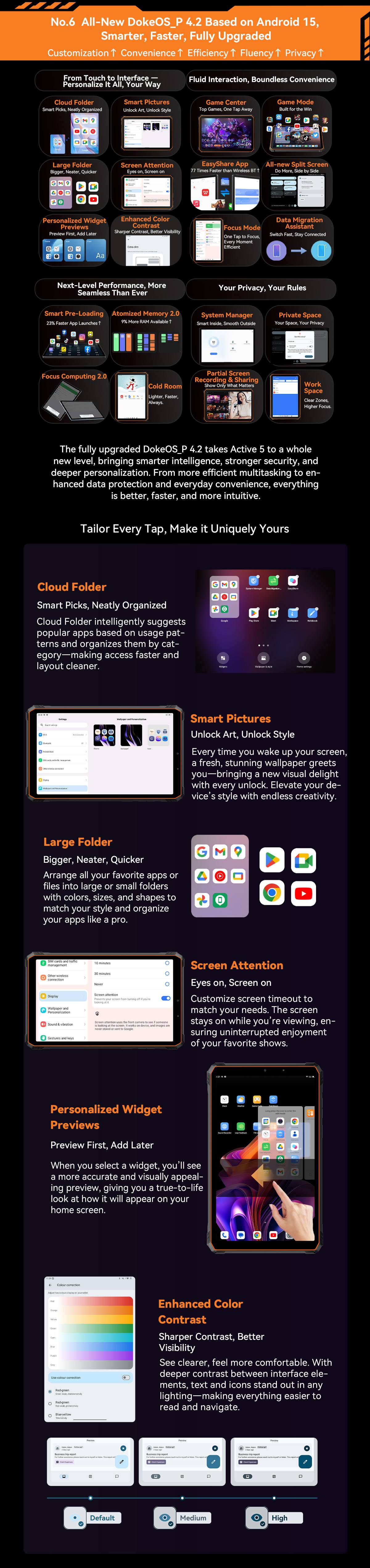 CPU :UMS9230E(T615), Octa core,2*A75@1.8GHz; 6*A55@1.6GHz Pad Net Wight:519g OS :Android 15 Screen :8.68'' 800*1340 FHD+IPS Display RAM :8GB+16GB Expension ROM:128GB+up to 2TB expansion Rear Camera :16MP Front Camera :13MP Battery :6600mAh with 18W fast charging SIM :Dual SIM Card or 1*SIM & 1*TF Card Navigation support :GPS, Glonass, Beidou, Galileo Other Features :OTG, FM, Google Play Wi-Fi Spec :BT5.2/IEEE802.11 b/g/n/a/ac(WiFi2.4/5) Network: 4G Band :FDD:B1/B3/B7/B8/B19/B20/B28A/B28B TDD :B40/B41 3G Band :WCDMA:B1/B8 2G Band :GSM:B2/B3/B5/B8