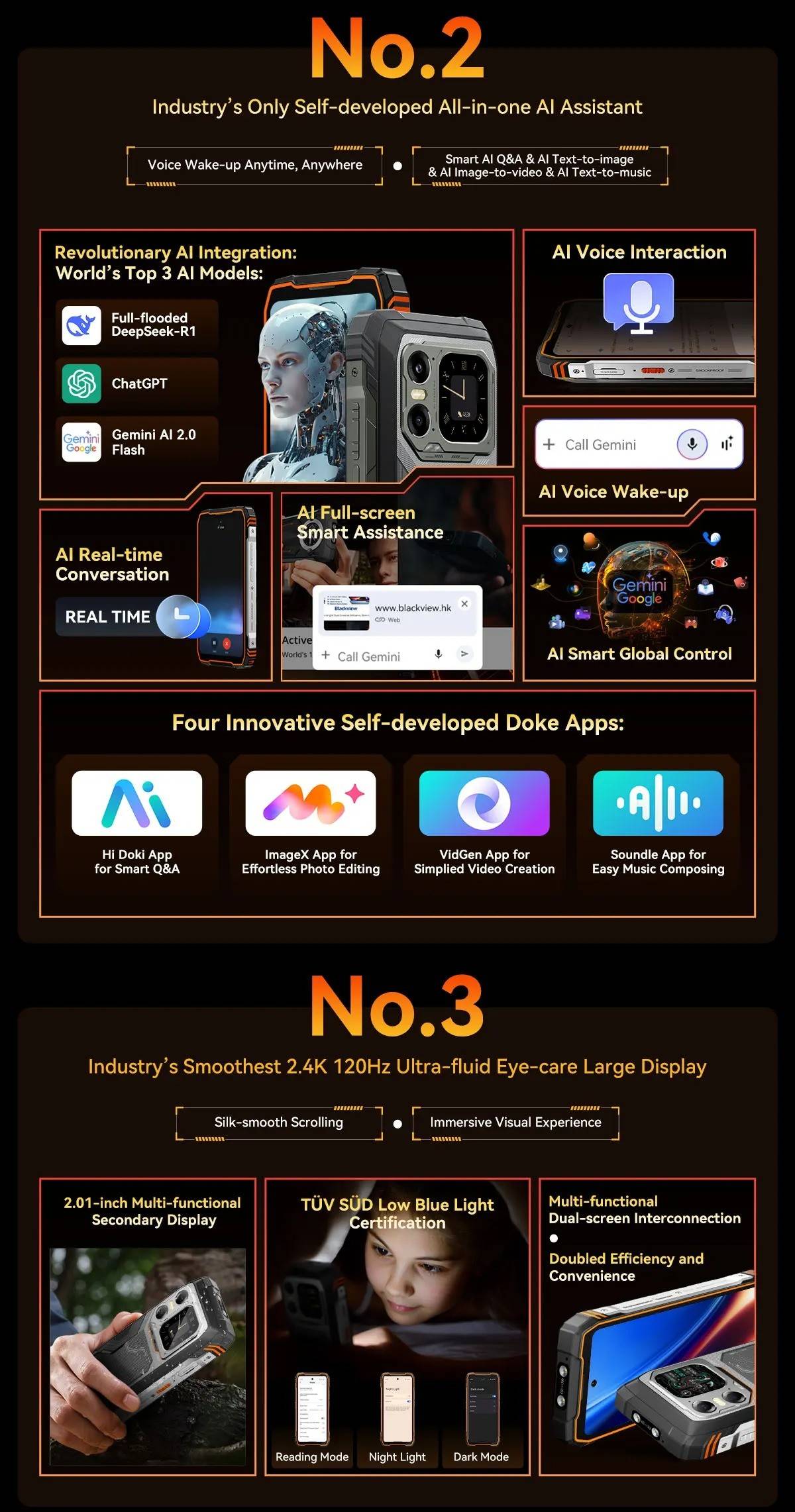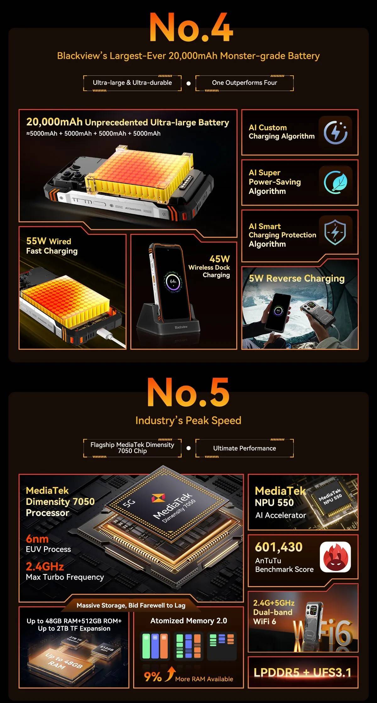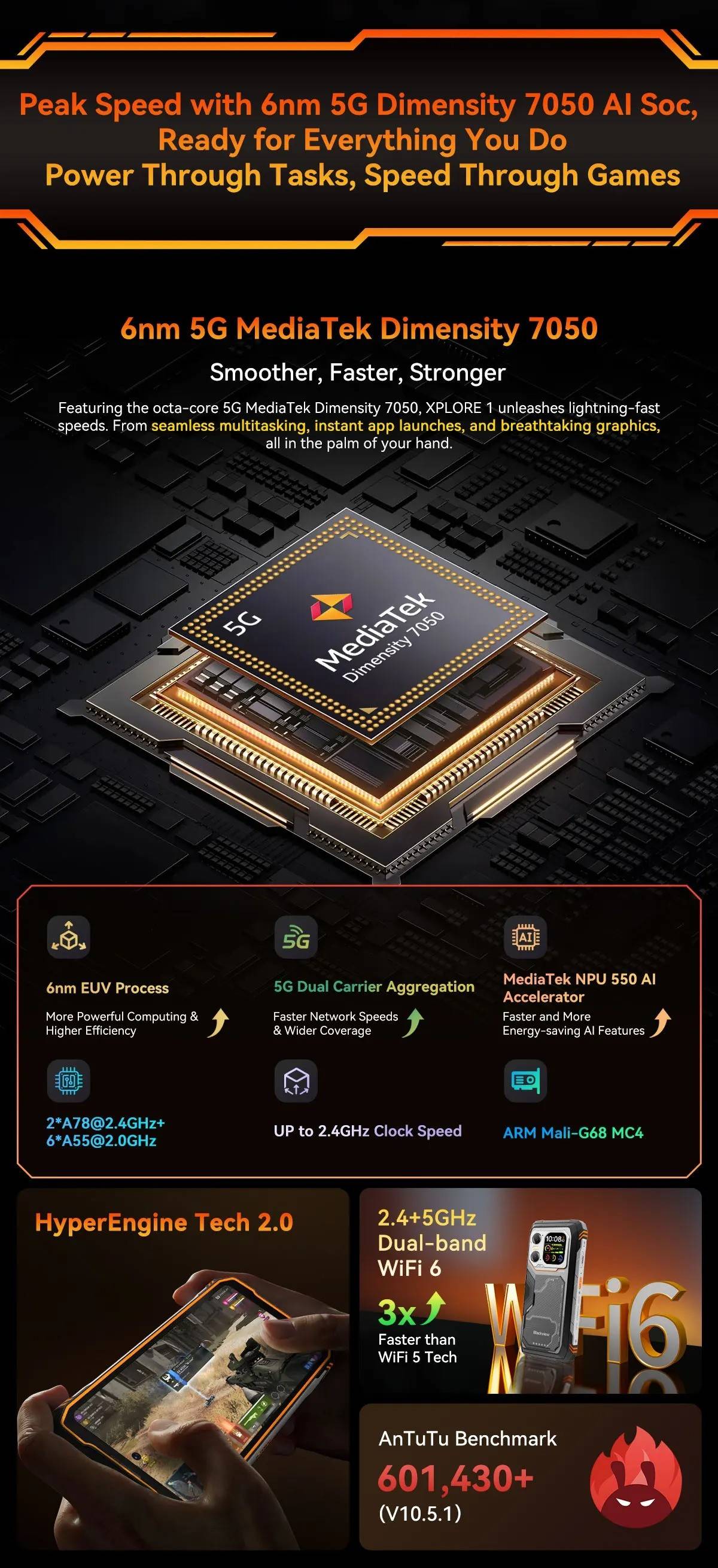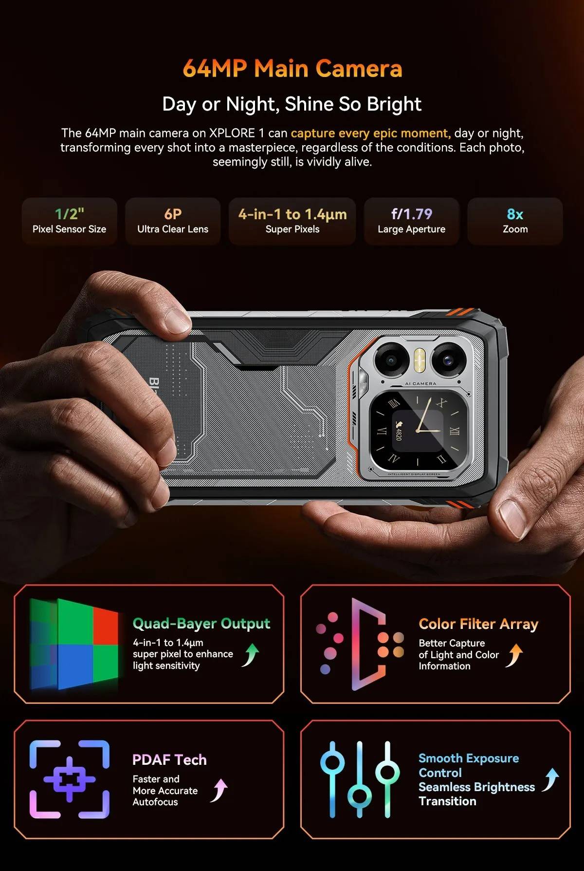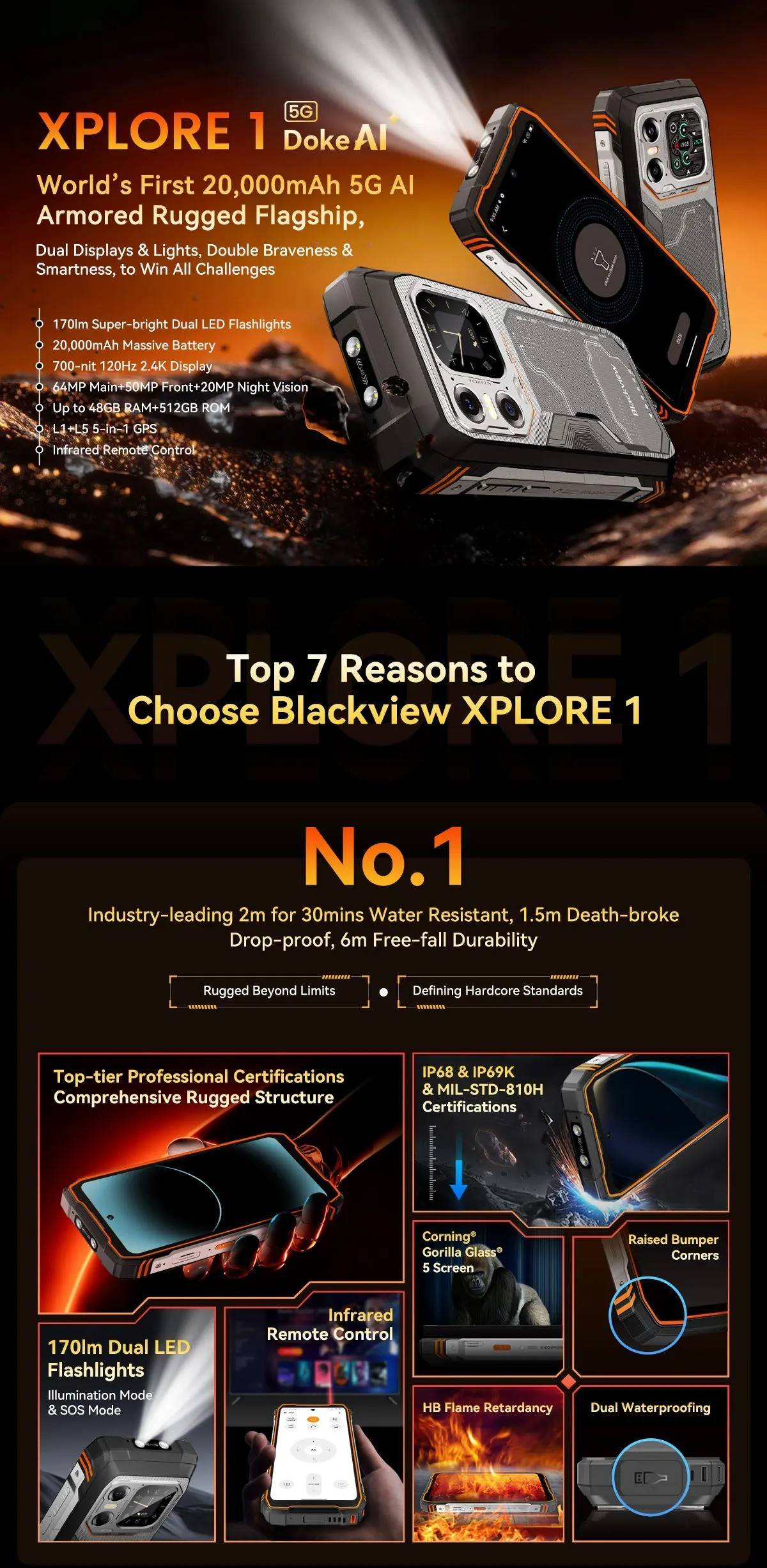 Model :Blackview XPLORE 1CPU :Octa-core 5G MediaTek Dimensity 7050, 6nm, Up to 2.4GHzDimension :184*83*29.5mmNet Weight :638gOS : Android 15.0Screen : 6.78-inch 2.4K FHD+IPS, 1080*2460 Resolution,Corning® Gorilla" Glass 5,120Hz Refresh Rate,Secondary Screen: 2.01-inch, 240*296 ResolutionRAM&ROM :12GB RAM & 256GBROM,LPDDR5+UFS3.1 ; 16GB RAM & 512GB ROM,LPDDR5+UFS3.1TF Expansion :Up to 2TB ExpansionRear Camera :64MP Main+20MP Night VisionFront Camera : 50MP (Samsung* ISOCELL JN1)Battery : 20000mAh Battery; 55W Fast ChargingCard Slot : 2* Nano SIM card/1*SIM+1*TF CardRugged Rating : IP68 &IP69K& MIL-STD-810HNavigation support : GPS/GLONASS/BeiDou/GalileoOther Features : OTG, FM,Fingerprint,NFC,AIWi-Fi&Bluetooth : IEEE802.11a/b/g/n/ac/ax(2.4GHz/5GHz);Bluetooth 5.2