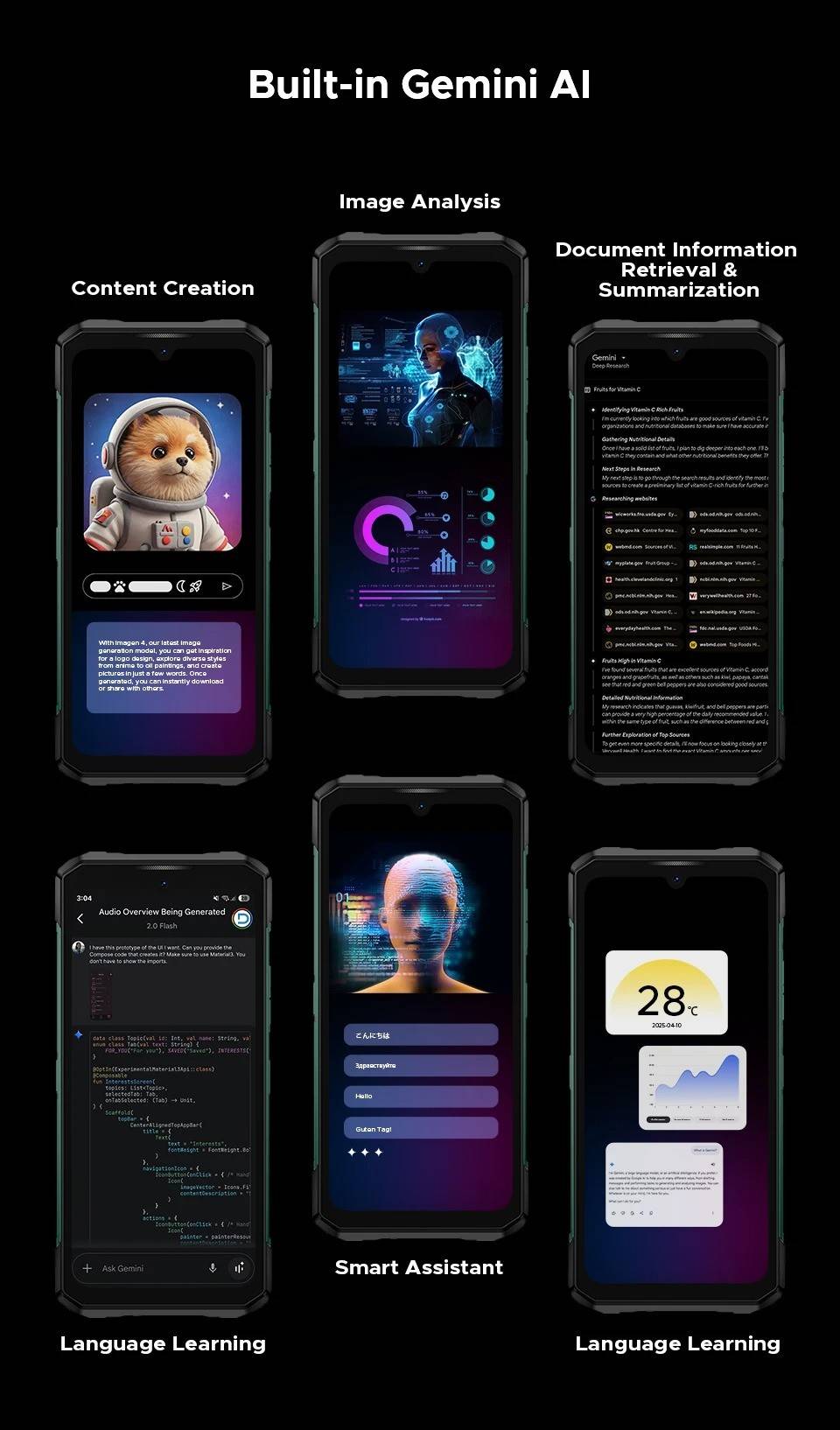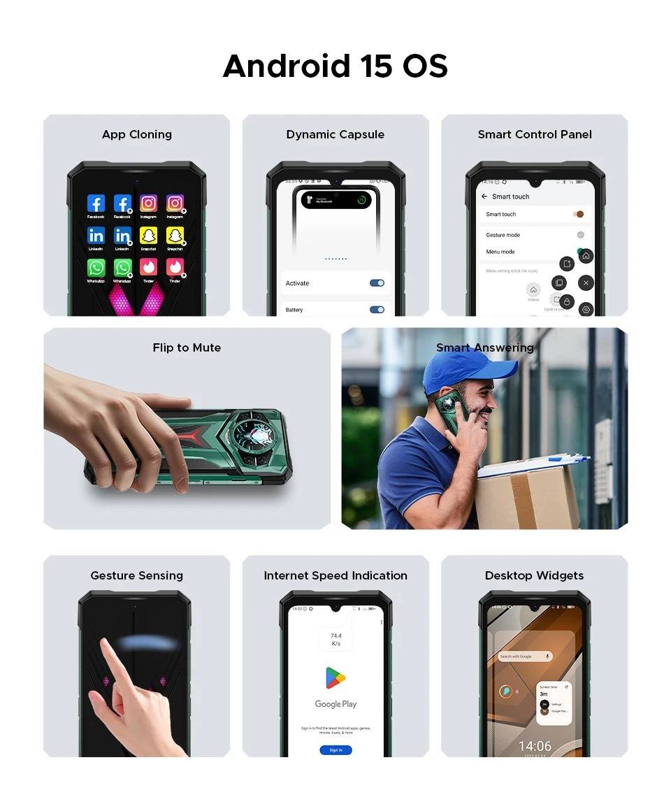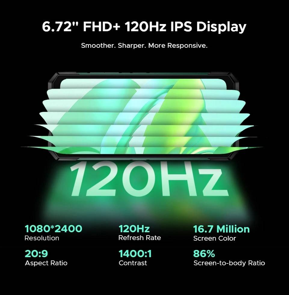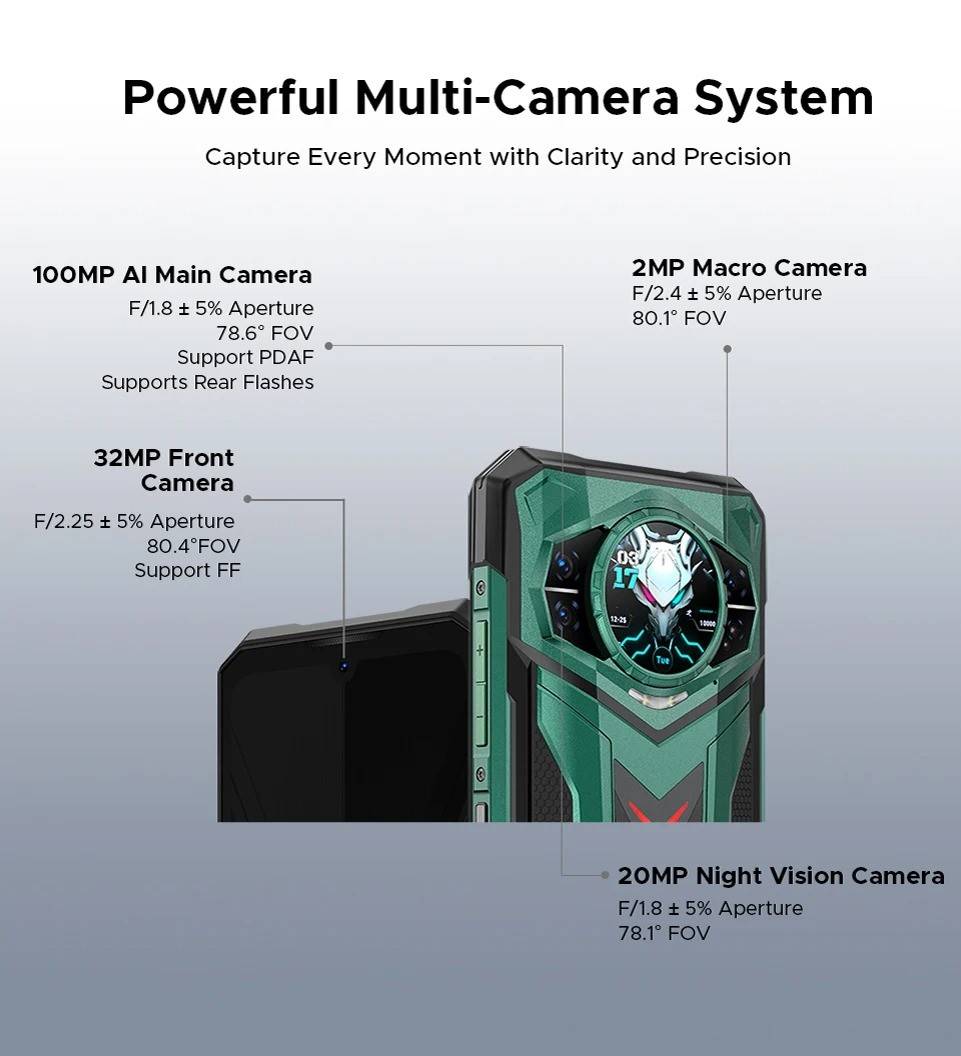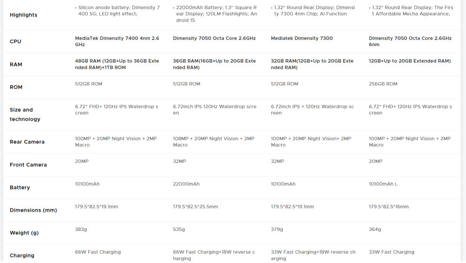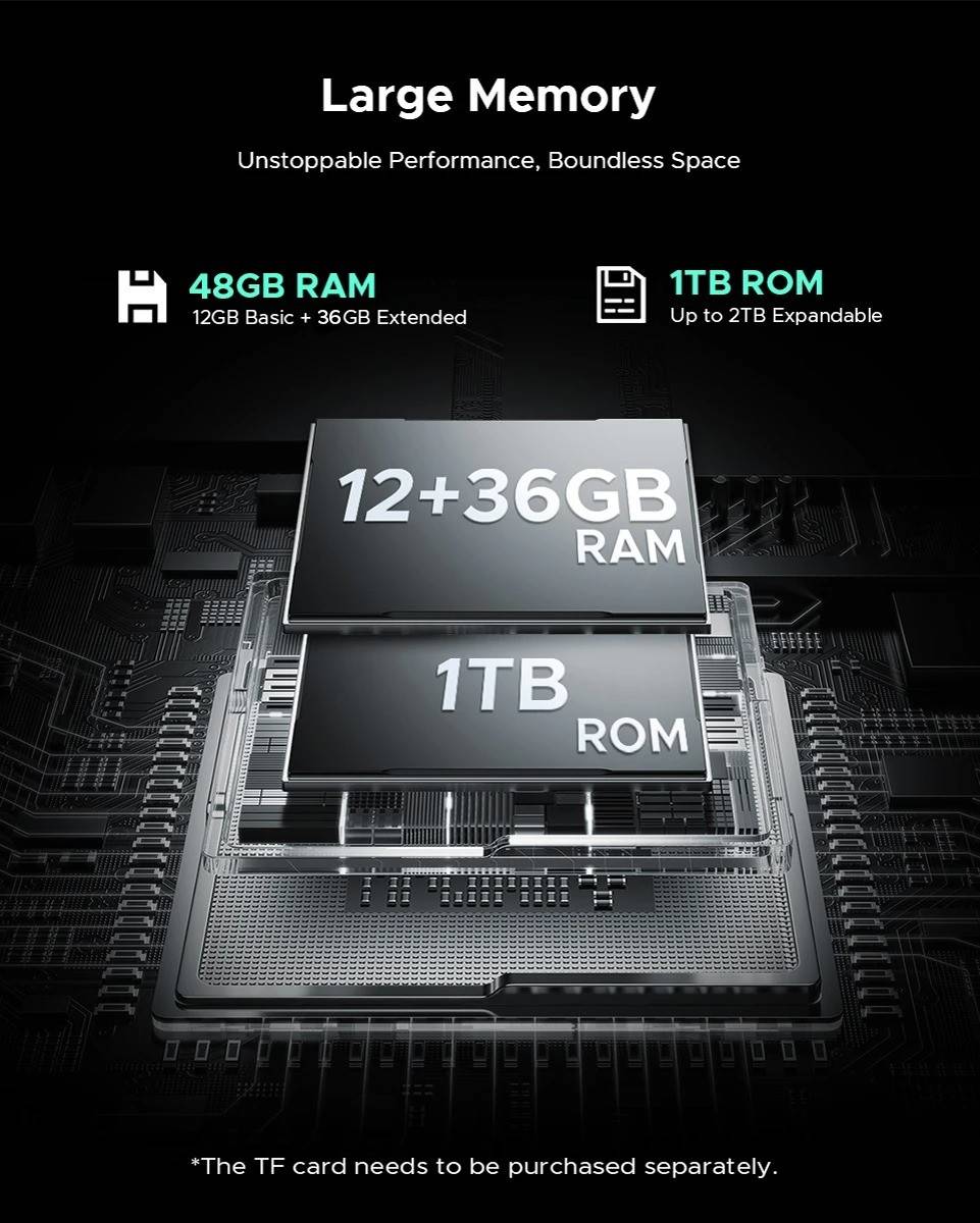 CPU:MediaTek Dimensity 7400/ 4nm / Octa Core / 2.6GHz Display:6.72" FHD+ 120Hz IPS Waterdrop screen Rear Display:1.32" AMOLED 60Hz multifunctional round rear display / 499 ppi Feature:LED light effect Rear Camera:100MP AI main camera+20MP Night vision camera+2MP Macro camera Front Camera:32MP Front Camera RAM & ROM:48GB RAM(12GB+Up to 36GB Extended RAM)+1TB ROM Max TF Card Capacity:2TB Battery capacity:11000mAh Large Battery / 66W Fast Charging/10W high power reverse charging OS:Android 15 Dimension & Weight:179.5*82.5*19.1mm & 383g SIM SIot:Support nano SIM + nano SIM or nano SIM card + TF card Wi-Fi:WiFi6E (802.11ax/ac/b/g/n) Navigation:GPS | Glonass | Galileo | Beidou | A-GPS L1+L5 Connectivity: NR:N1/N3/N7/N8/N28/N38/N41/N77/N78/N79 FDD:1/2/3/4/5/7/8/12/17/18/19/20/25/26/28AB/66 TDD:B34/38/39/40/41 WCDMA:B1/2/4/5/8 GSM: B2/3/5/8 Support EDGE/GPRS