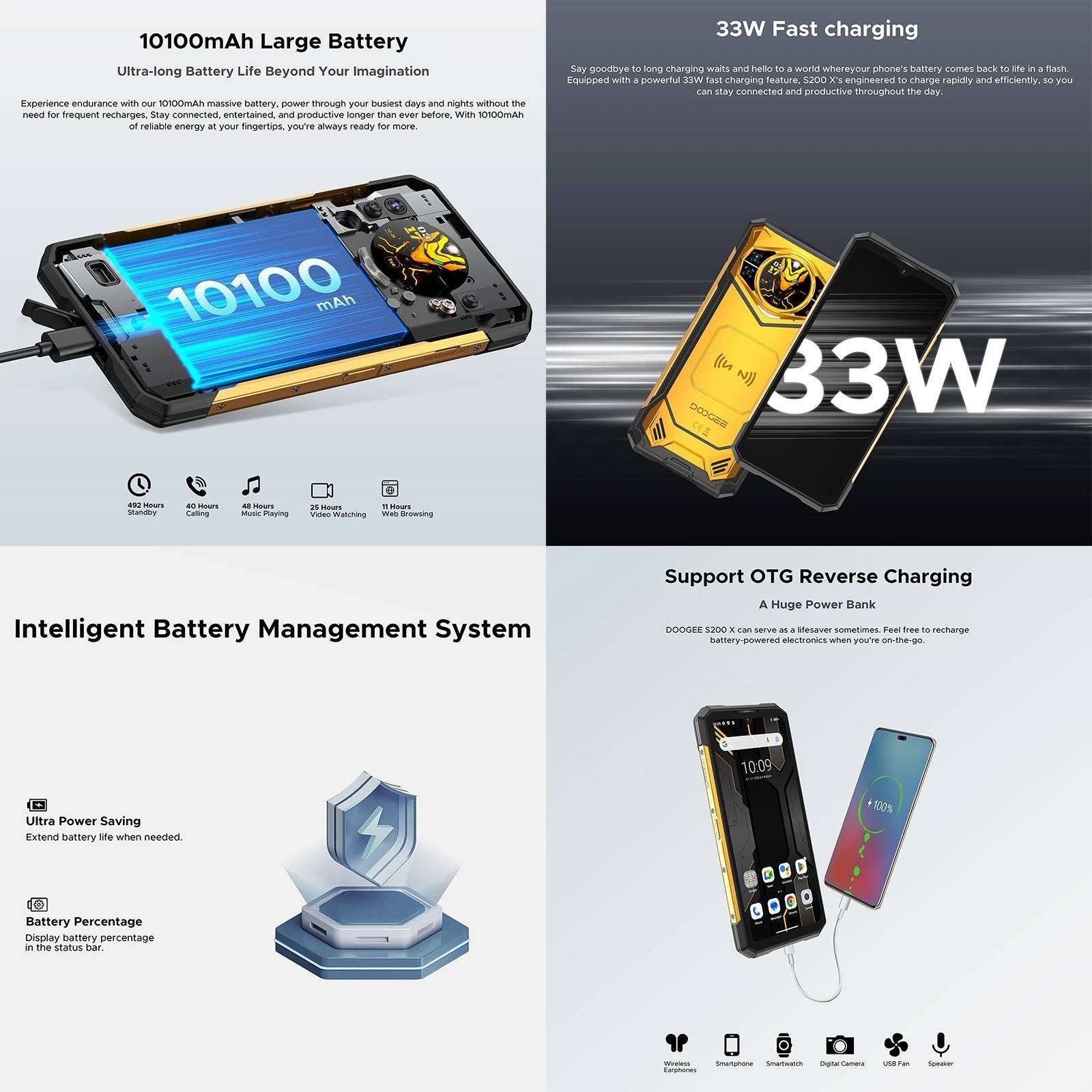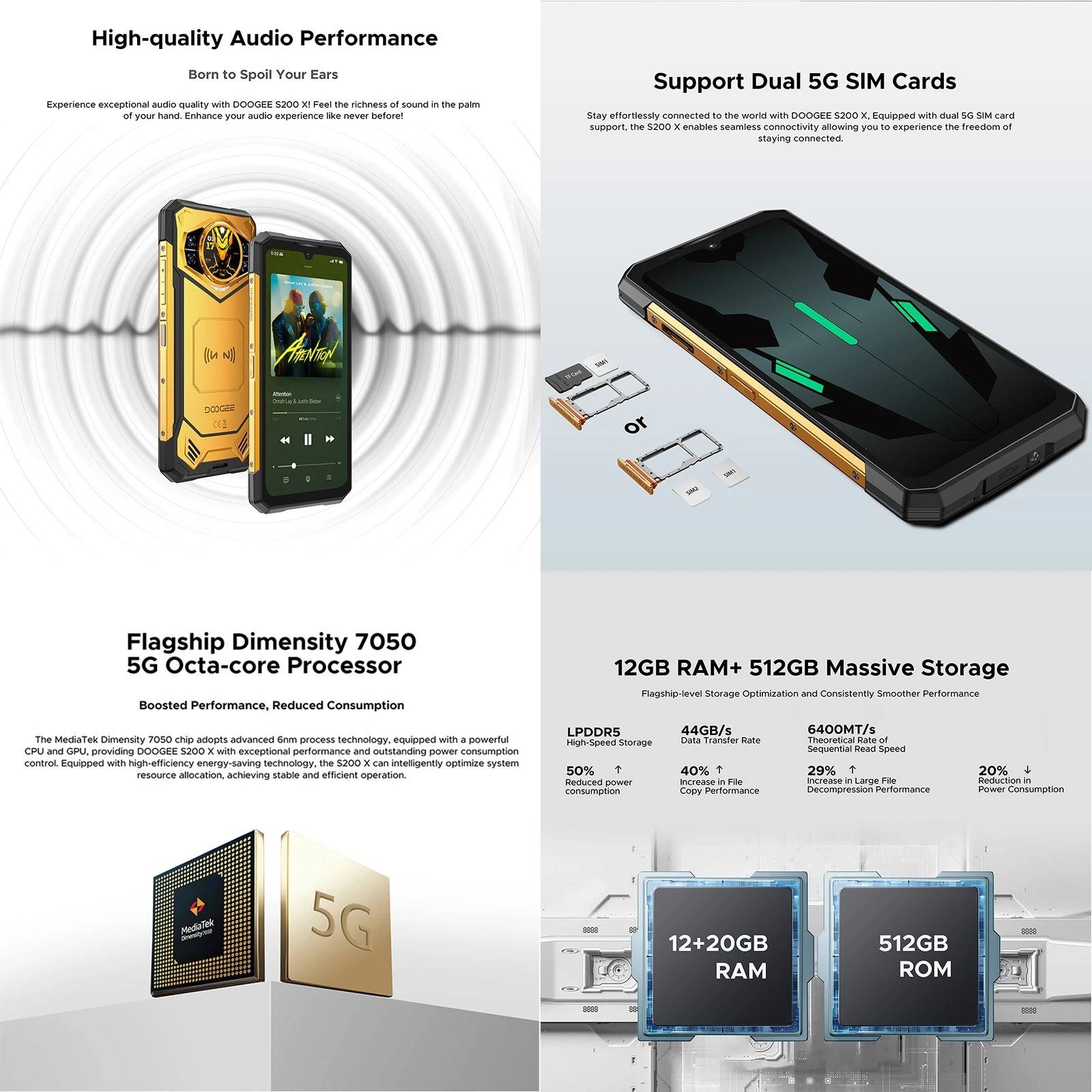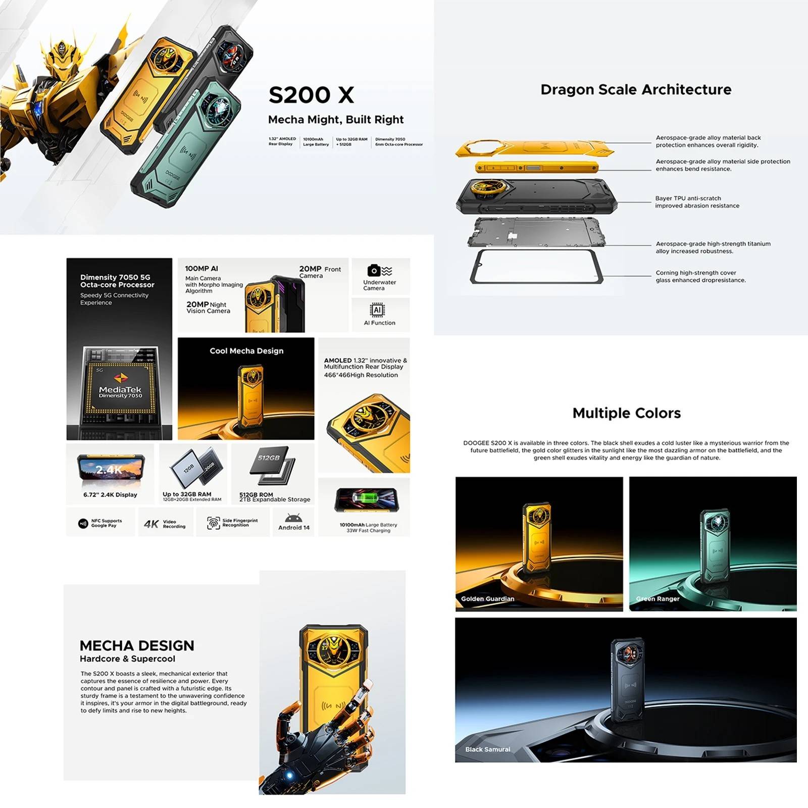 OS: Android 14 CPU: Dimensity 7050 RAM: 32GB RAM(12GB + Up to 20GB Extended virtual RAM) Display: 6.72 inch ROM: 512GB Front Camera: 20MP SIM Card: Nano Sim card + Nano Sim card + T card (choose two from three) Rear Camera: 100MP + 20MP Night Vision + 2MP Macro Battery:10100mAh Features: 33W, support fast charge Network: 5G NR: N1/N3/N7/N8/N28/N38/N41/N77/N78/N79 4G: FDD-LTE B1/2/3/4/5/7/8/12/17/18/19/20/25/26/28AB/66; TDD-LTE: B34/38/39/40/41 3G: WCDMA: B1/2/4/5/8 2G: GSM: B2/B3/B5/B8 Support 4G VoLTEE