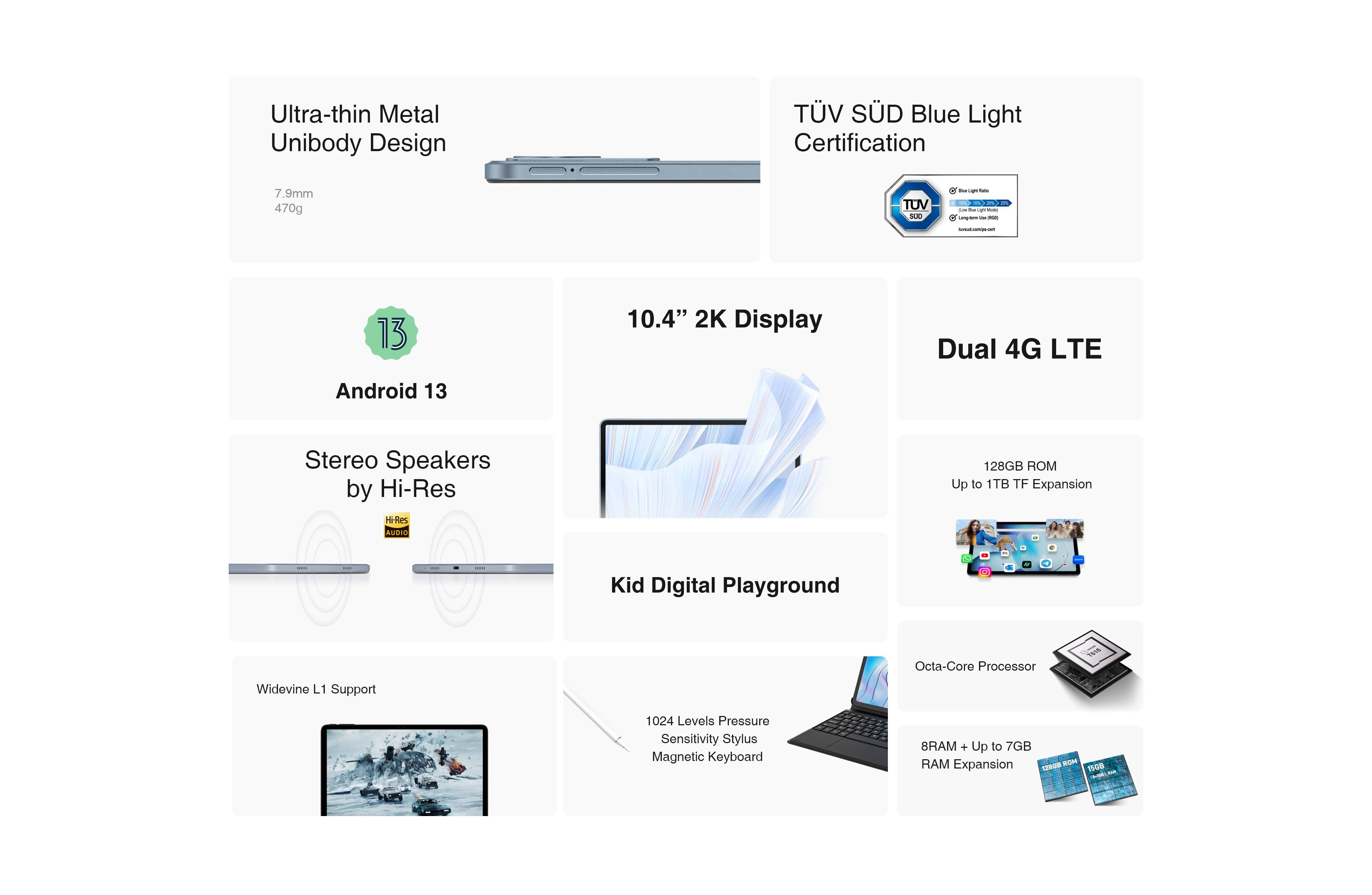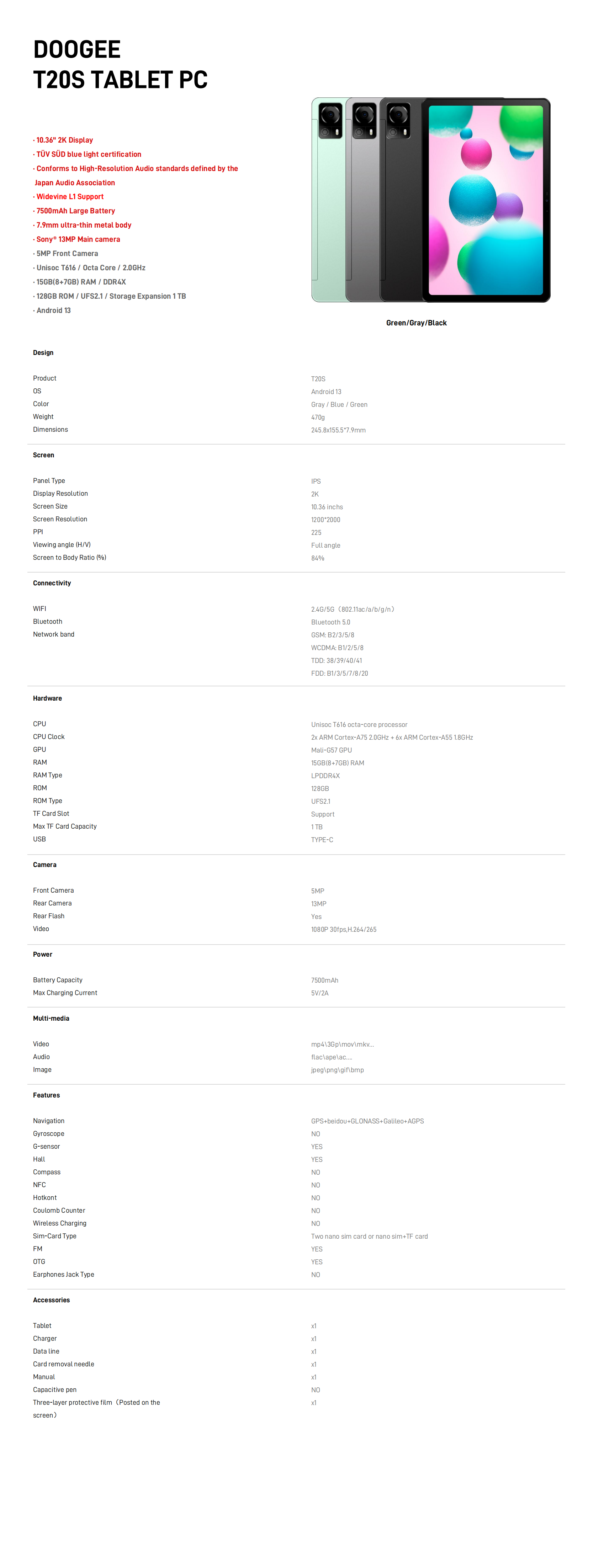 Doogee T20S UNISOC T616 Octa-core 8GB+7GB Extended RAM 128GB ROM 10.36-inch 2K Full HD screen Android 13 Tablet