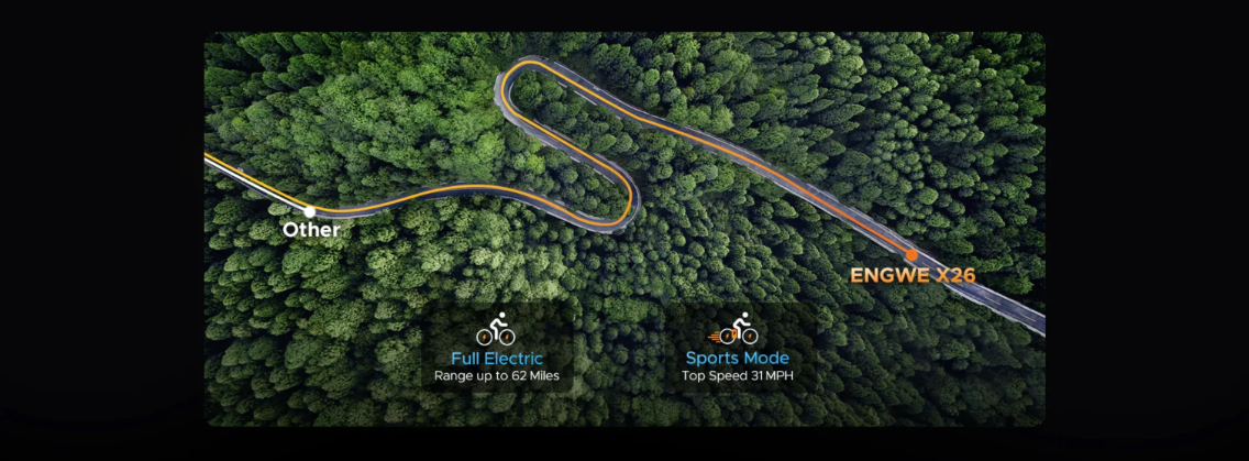 ENGWE X26 Key Features 1000W (1200W Peak) motor with a top speed of 31 mph. 19.2Ah + 10Ah dual removable batteries with a max range of up to 62 miles. Triple suspension system for powerful shock absorption. 26 x 4.0 inch fat tire one piece wheels to conquer all types of terrain.