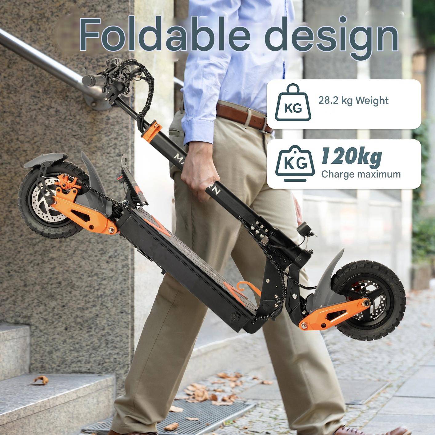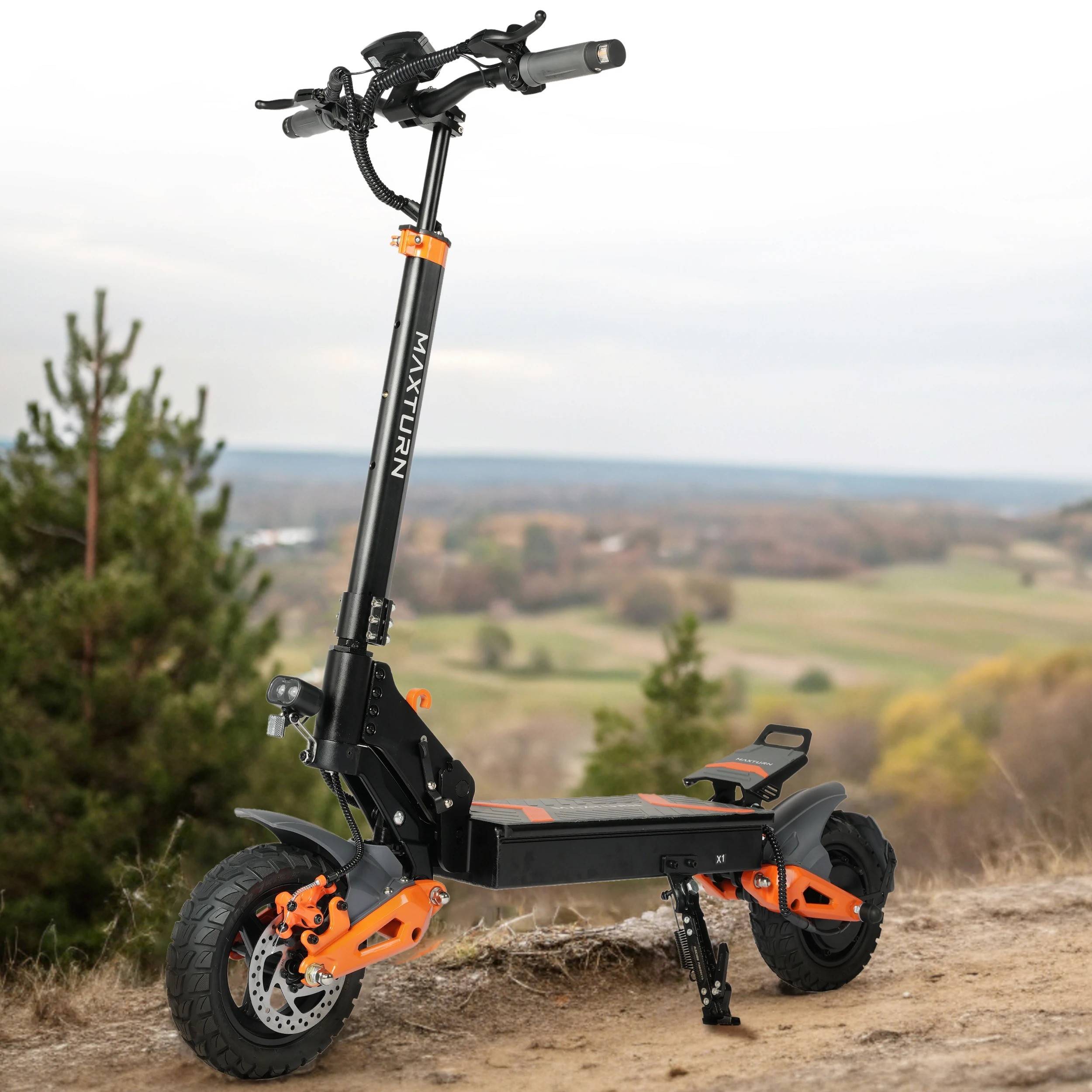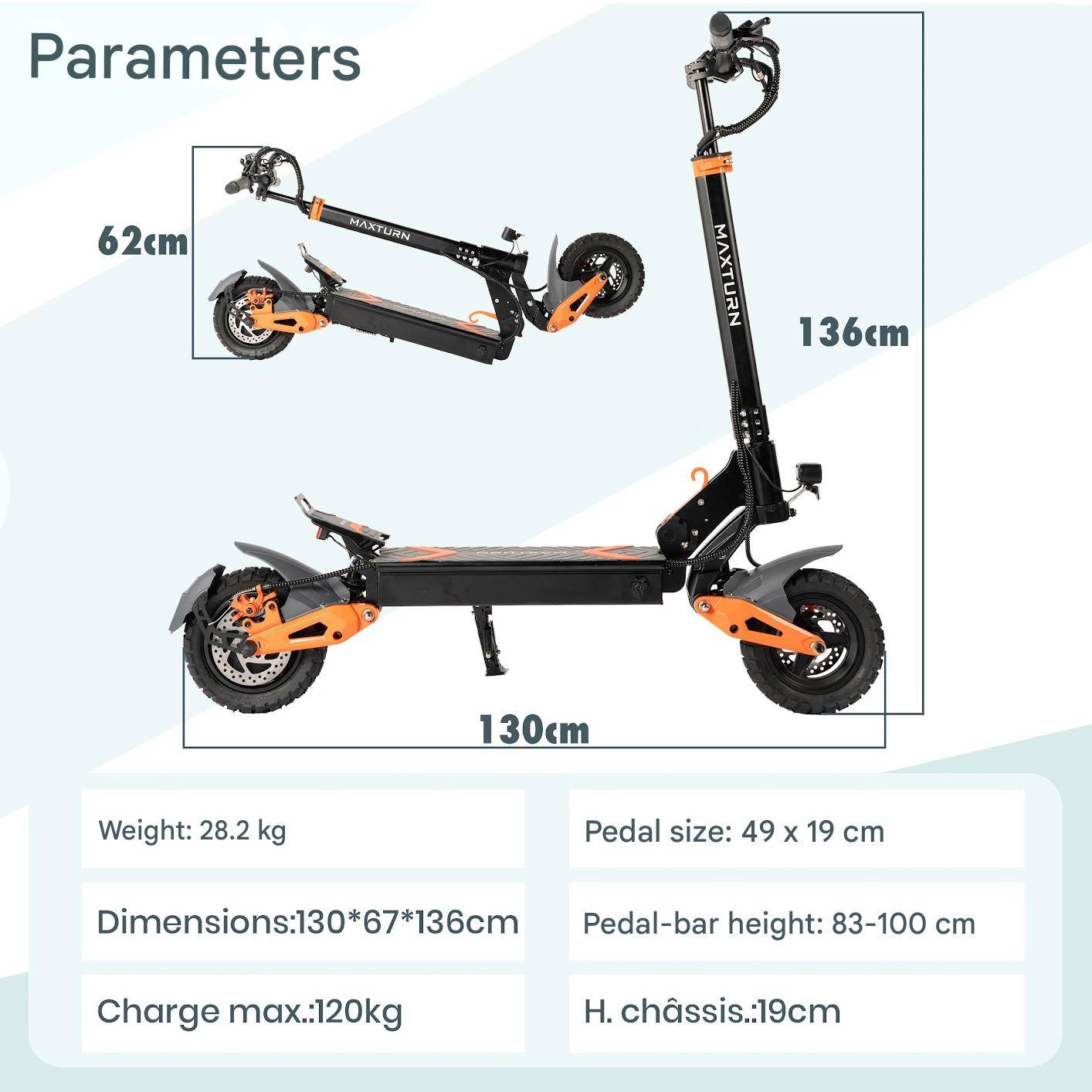 Brand:MAXTURN Model:X1 Material:Aluminum Alloy Tire Size:10inch Vacuum Tires Brake:Front and Rear Disc Brakes + Power-off Brake Tire Pressure:340kpa(50psi) Shock Absrober:Front and RearHydraulic Shock Absorber Motor:48V 1000W NPC Function:Support Peak Power:1200W Display:NFC-Activated LED Display Max Torque:43N.m Light:Front Light, Taillight, Turn Signal Light Max Speed:45KM/H Package Size:128*24*46CM Max Mileage Range:50KM Overall Size:1300*670*1360mm Battery:48V 15.6AH Folding Size:1300*670*620mm Charging time:6-7 Hours Handlebar Size:670mm Charger Output Voltage and Current:54.6V 2A Gross Weight:32.3KG Charger Input Voltage:100-240VAC-50/60Hz Net Weight:28.2KG Gradeability:22° Max Load: 120KG Waterproof Level:IP54 Certification:CE Color:Black