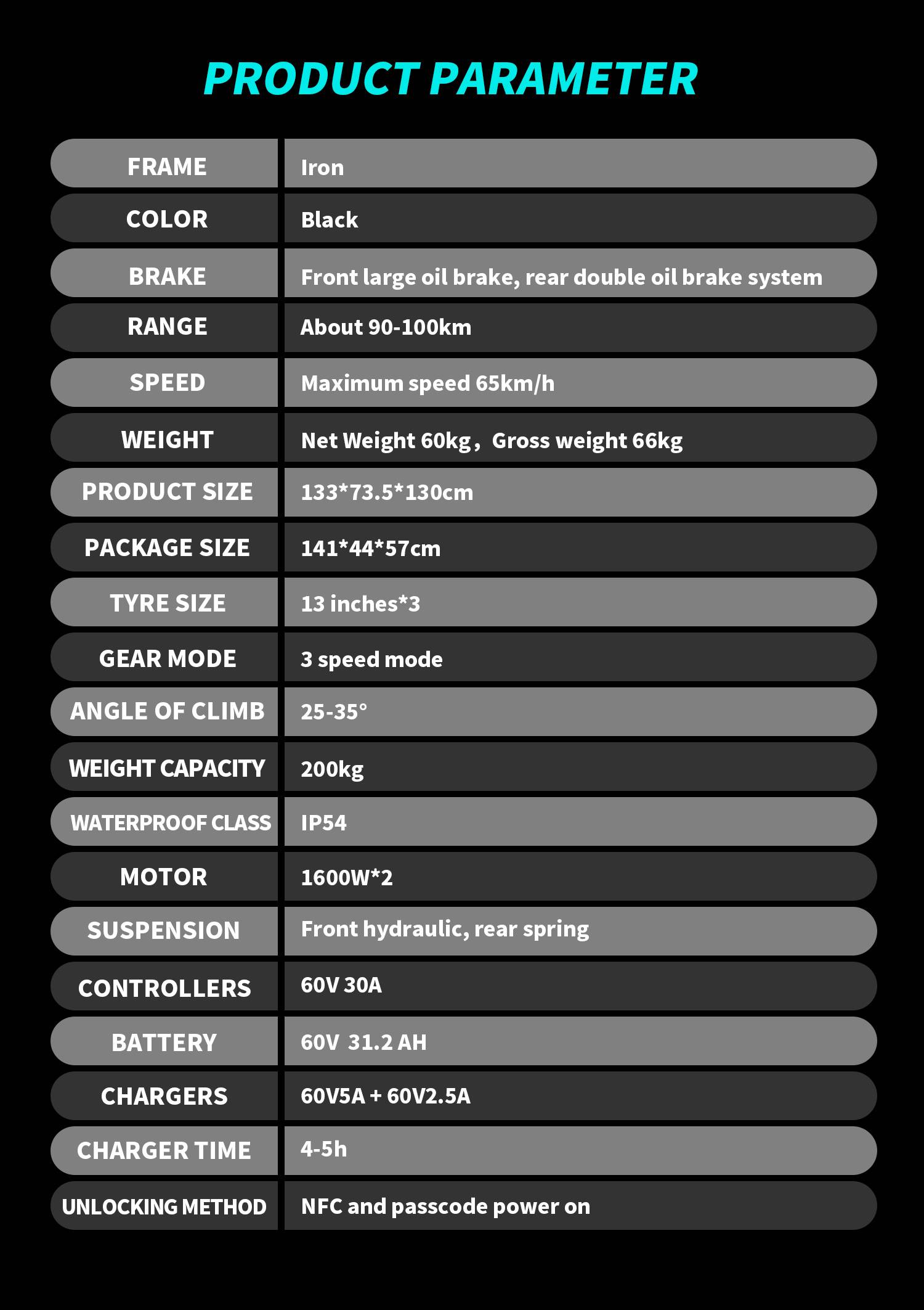 Charger:Equipped with two chargers: 60V 5A and 60V 2.5A