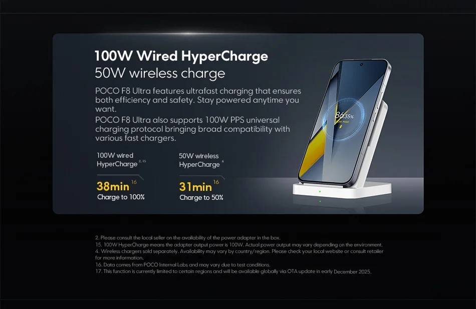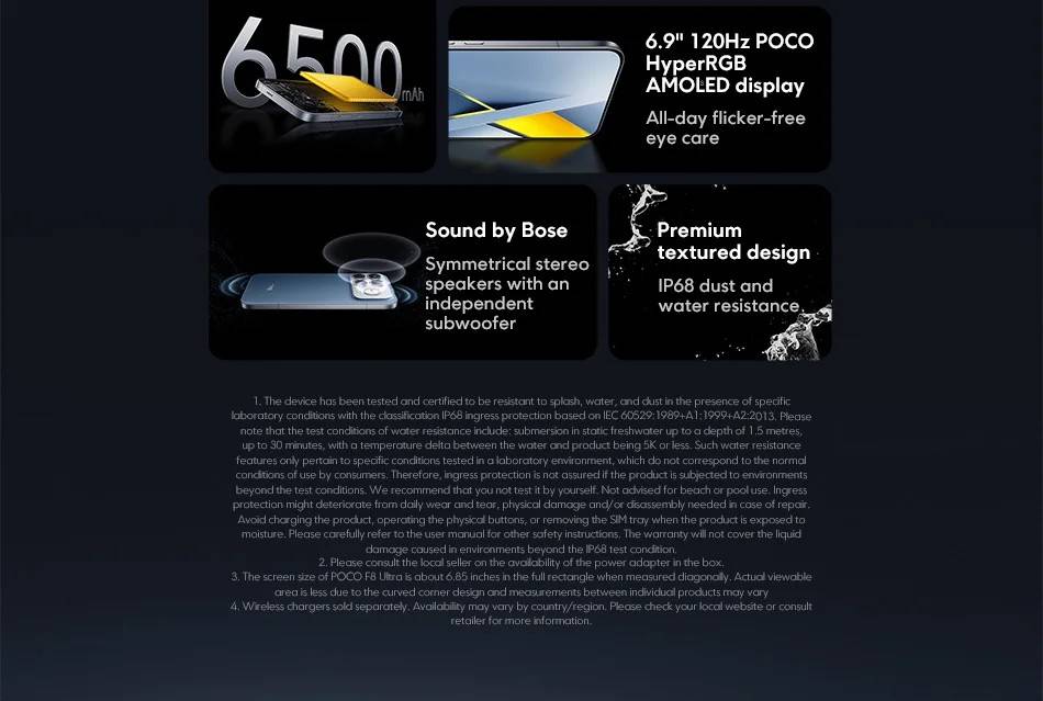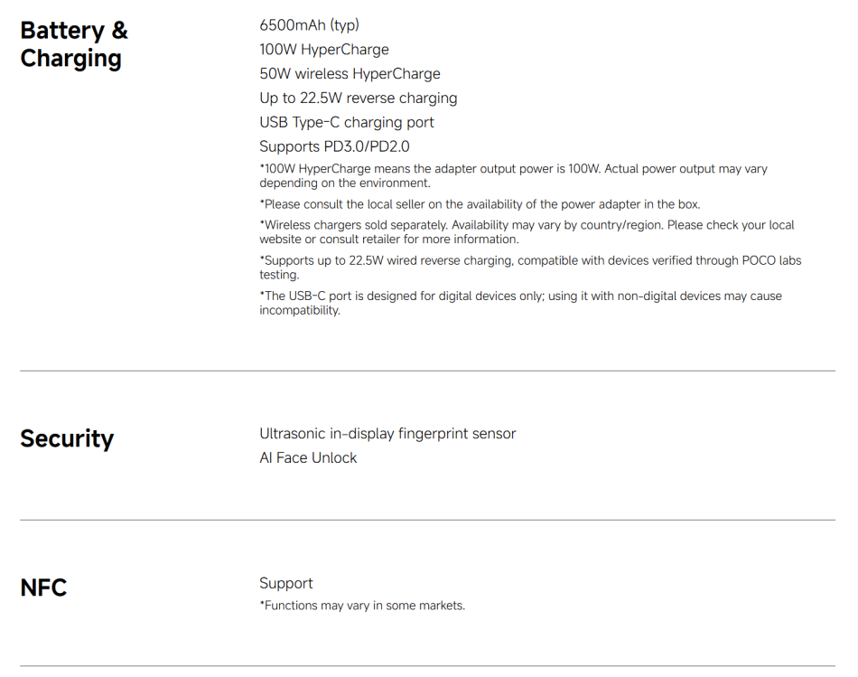 Resolution:2608 × 1200 POCO HyperRGB Refresh rate:Up to 120Hz RAM+ROM --12GB + 256GB/ 16GB + 512GB Colors : Black, Blue Camera ------50MP Main Camera With OlS+50MP Periscope Telephoto Camera+50MP Ultra-Wide-Angle, 32MP Front Camera Battery ------6500mAh (typ) battery, 100W HypeCharge,50W wireless HyperCharge(22.5W Reverse Charging) OS-----------Powered by Xiaomi HyperOS 3, Support Multi-Language and Google Play,Ultrasonic in-display fingerprint sensor,