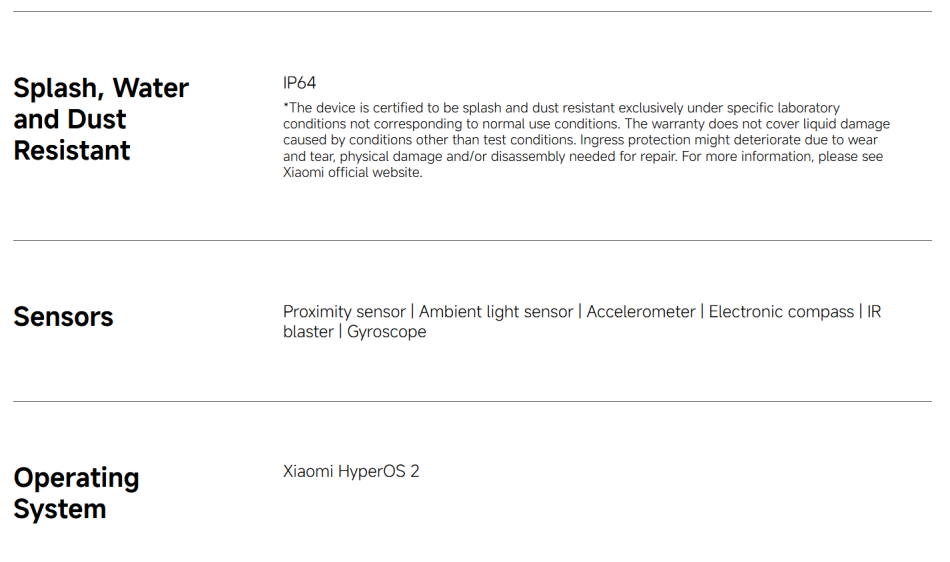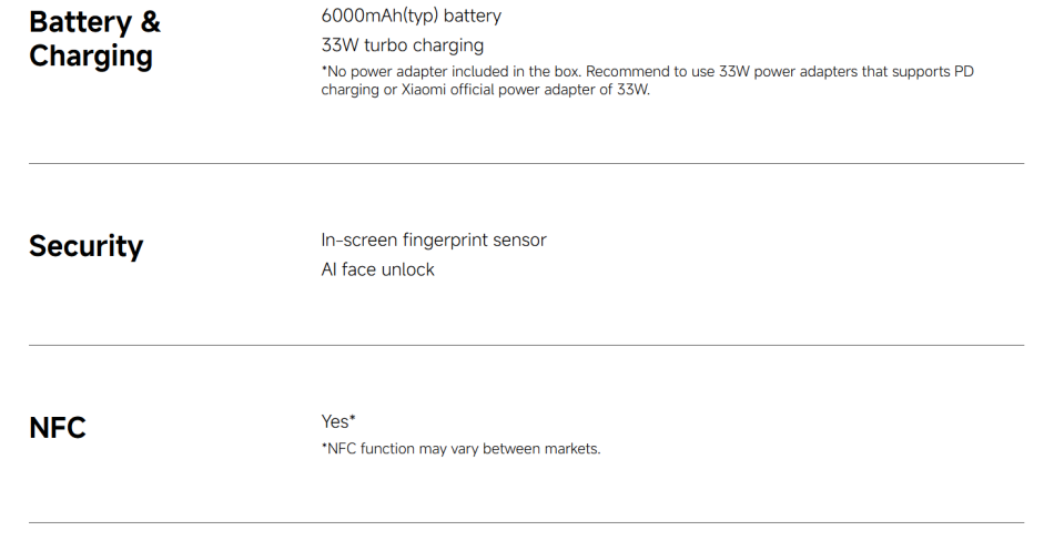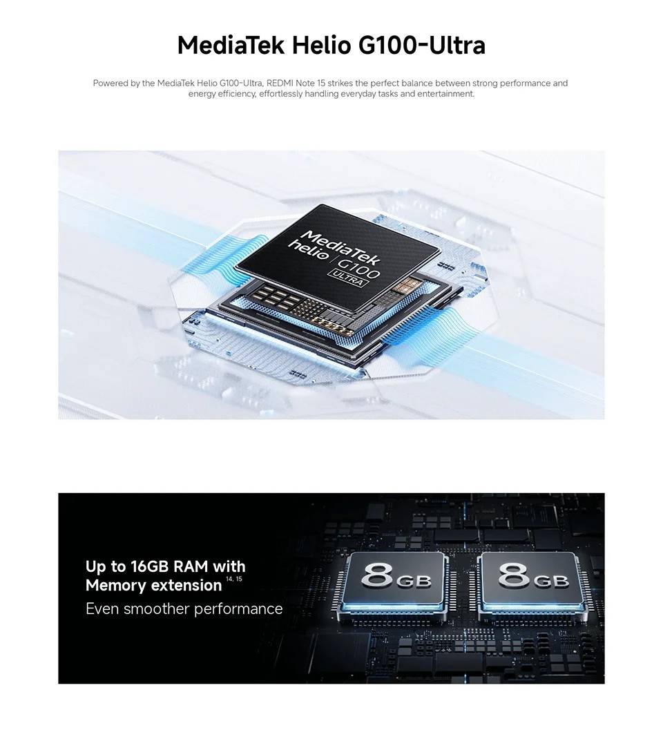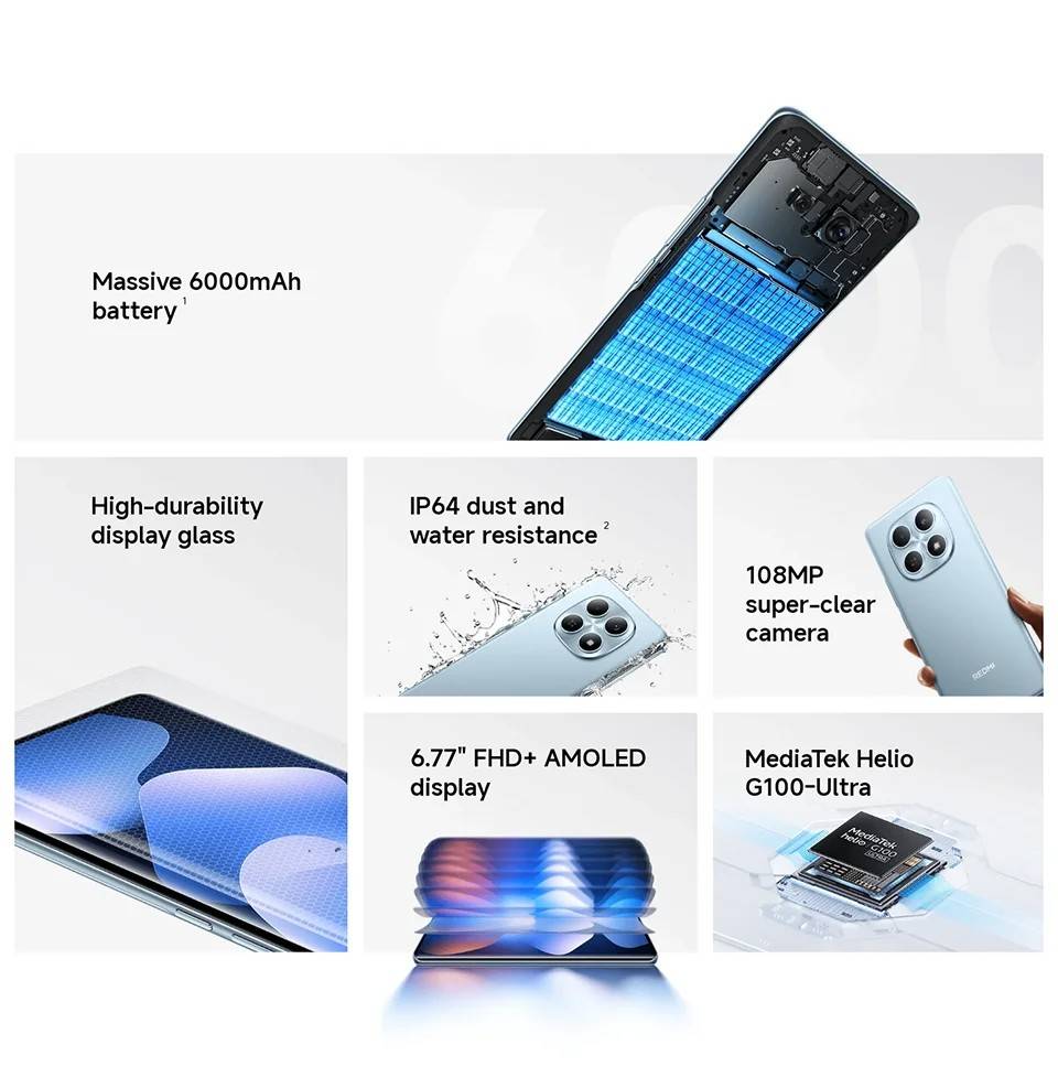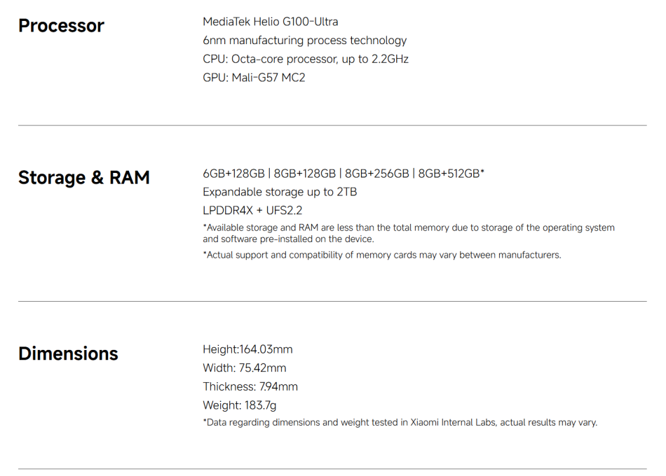 CPU ------------- MediaTek Helio G100-Ultra RAM+ROM ---- 6GB + 128GB | 8GB + 256GB Color ----------- Black| Blue| Green| Purple Screen ---------- 6.77" AMOLED display, 120Hz refresh rate Battery --------- 6000mAh (typ) battery, 33W turbo charging Camera -------- 108MP main camera + 2MP depth camera, 20MP front camera OS -------------- Global Version, Powered by Xiaomi HyperOS 2 Support Multi-Language and Google Play, In-screen fingerprint sensor、AI Face Unlock, Other ----------- Bluetooth 5.3, IP64 dust and water-resistant Network and Connectivity (SIM 1 + Hybrid (SIM or microSD) Dual standby) • 4G: LTE FDD:38/40/41 • 4G: LTE TDD:1/2/3/4/5/7/8/12/13/17/18/19/26/28/66 • 4G: LTE FDD:1/3/5/7/8/20/28 • 3G: WCDMA:1/2/4/5/6/8/19 • 3G: WCDMA:1/5/8 • 2G: GSM: 850 900 1800 1900MHz *Note: Please confirm the network frequency with local operator for ensure the network compatible before order!