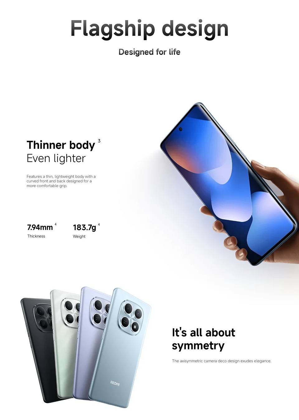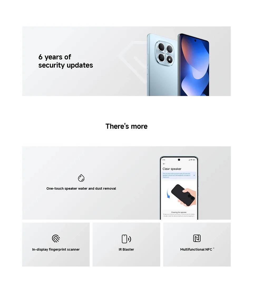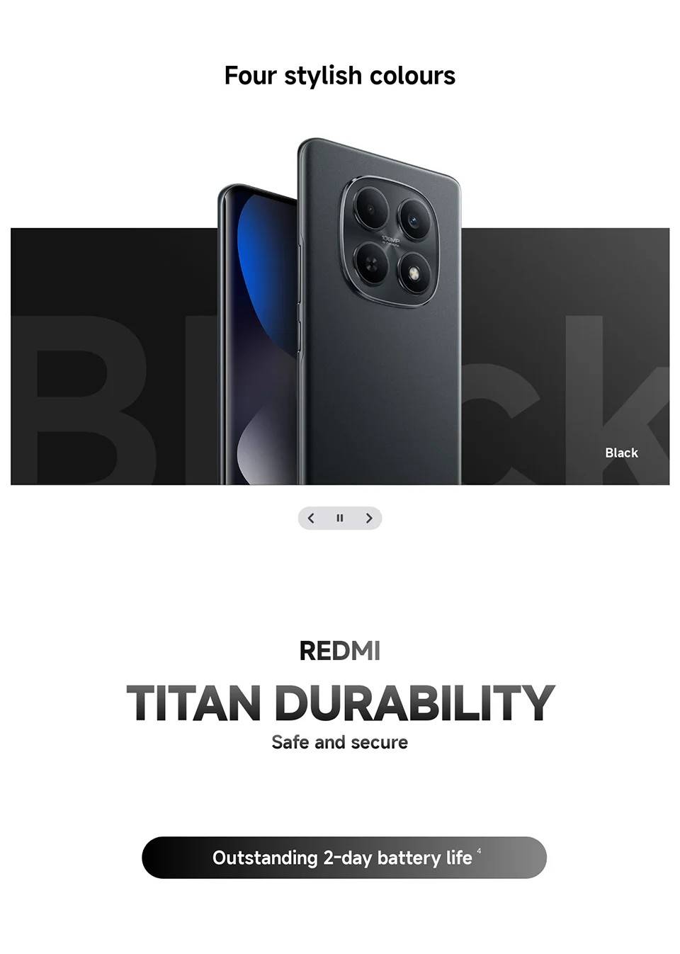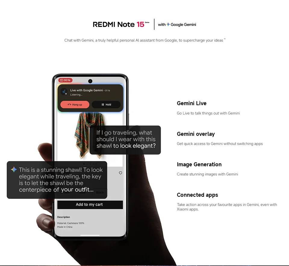 CPU ------------- MediaTek Helio G100-Ultra RAM+ROM ---- 6GB + 128GB | 8GB + 256GB Color ----------- Black| Blue| Green| Purple Screen ---------- 6.77" AMOLED display, 120Hz refresh rate Battery --------- 6000mAh (typ) battery, 33W turbo charging Camera -------- 108MP main camera + 2MP depth camera, 20MP front camera OS -------------- Global Version, Powered by Xiaomi HyperOS 2 Support Multi-Language and Google Play, In-screen fingerprint sensor、AI Face Unlock, Other ----------- Bluetooth 5.3, IP64 dust and water-resistant Network and Connectivity (SIM 1 + Hybrid (SIM or microSD) Dual standby) • 4G: LTE FDD:38/40/41 • 4G: LTE TDD:1/2/3/4/5/7/8/12/13/17/18/19/26/28/66 • 4G: LTE FDD:1/3/5/7/8/20/28 • 3G: WCDMA:1/2/4/5/6/8/19 • 3G: WCDMA:1/5/8 • 2G: GSM: 850 900 1800 1900MHz *Note: Please confirm the network frequency with local operator for ensure the network compatible before order!