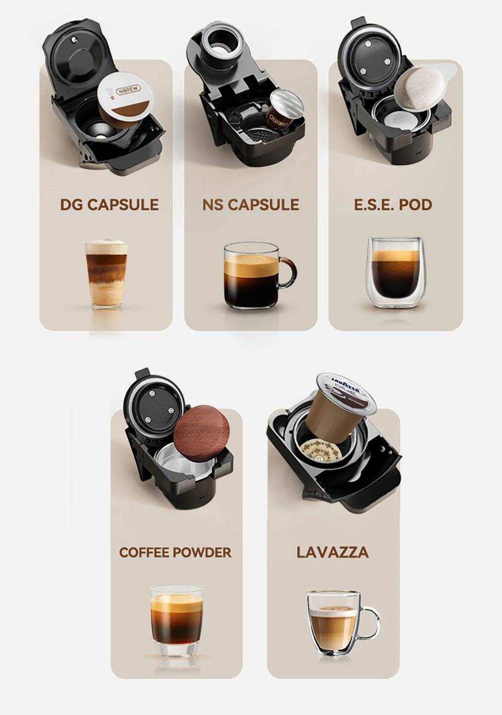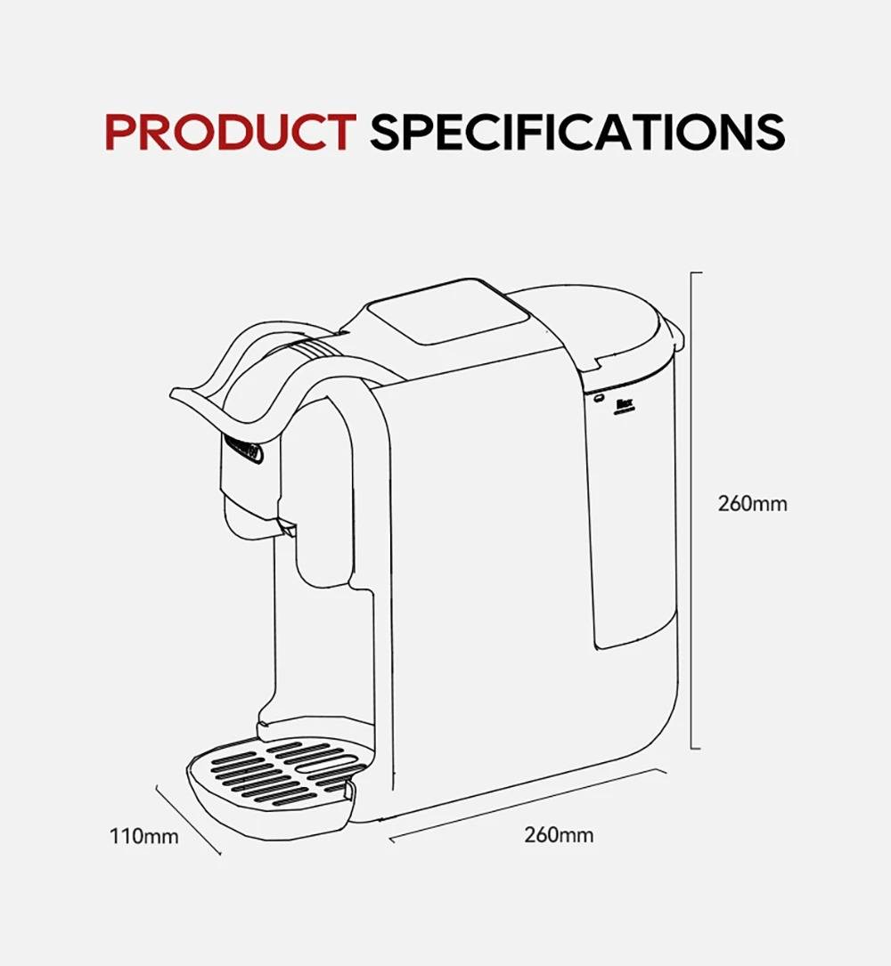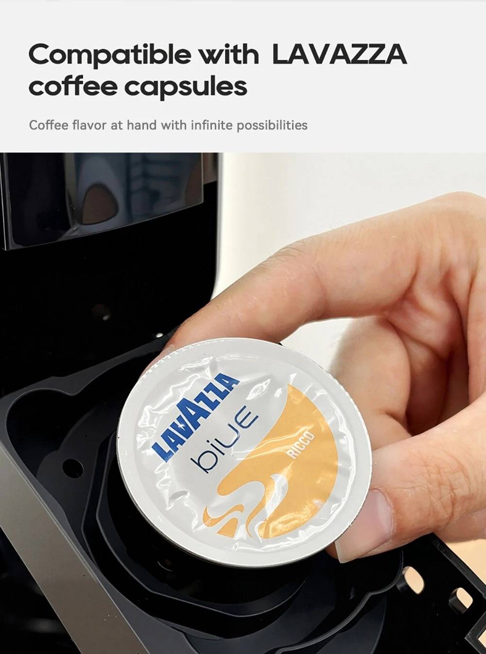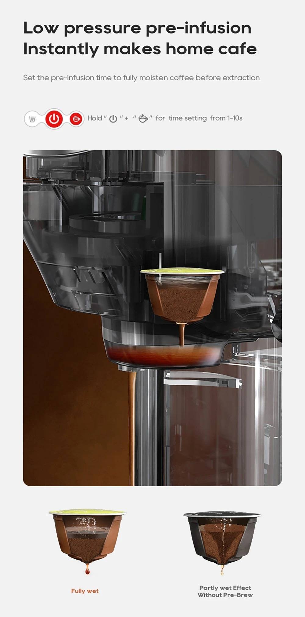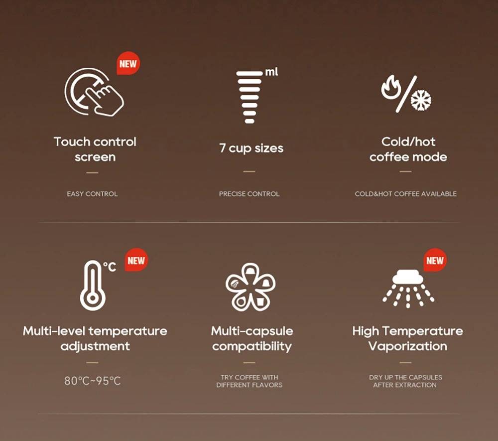 New Touchscreen Display: Simple and intuitive to operate. 7 Adjustable Water Levels: Precisely control water volume and customize coffee strength. High-Temperature Steam Drying Technology: After extraction, the capsule is dried to remove almost all residual water. The steam process expels remaining water to prevent dripping. Hot & Cold Coffee with Multi-Level Temperature Control: Adjustable settings for precise brewing, delivering a smoother and richer taste. Optimal extraction at 80–85 °C for high efficiency. Electromagnetic Valve Pressure Release: At the end of brewing, the valve automatically releases pressure so the handle can be opened effortlessly. Low-Pressure Pre-Infusion: Programmable pre-brewing time ensures the coffee grounds are evenly moistened before full extraction. Wide Capsule Compatibility: Supports DG large capsules, Nespresso capsules, Lavazza capsules, ground coffee, and ESE PODs.