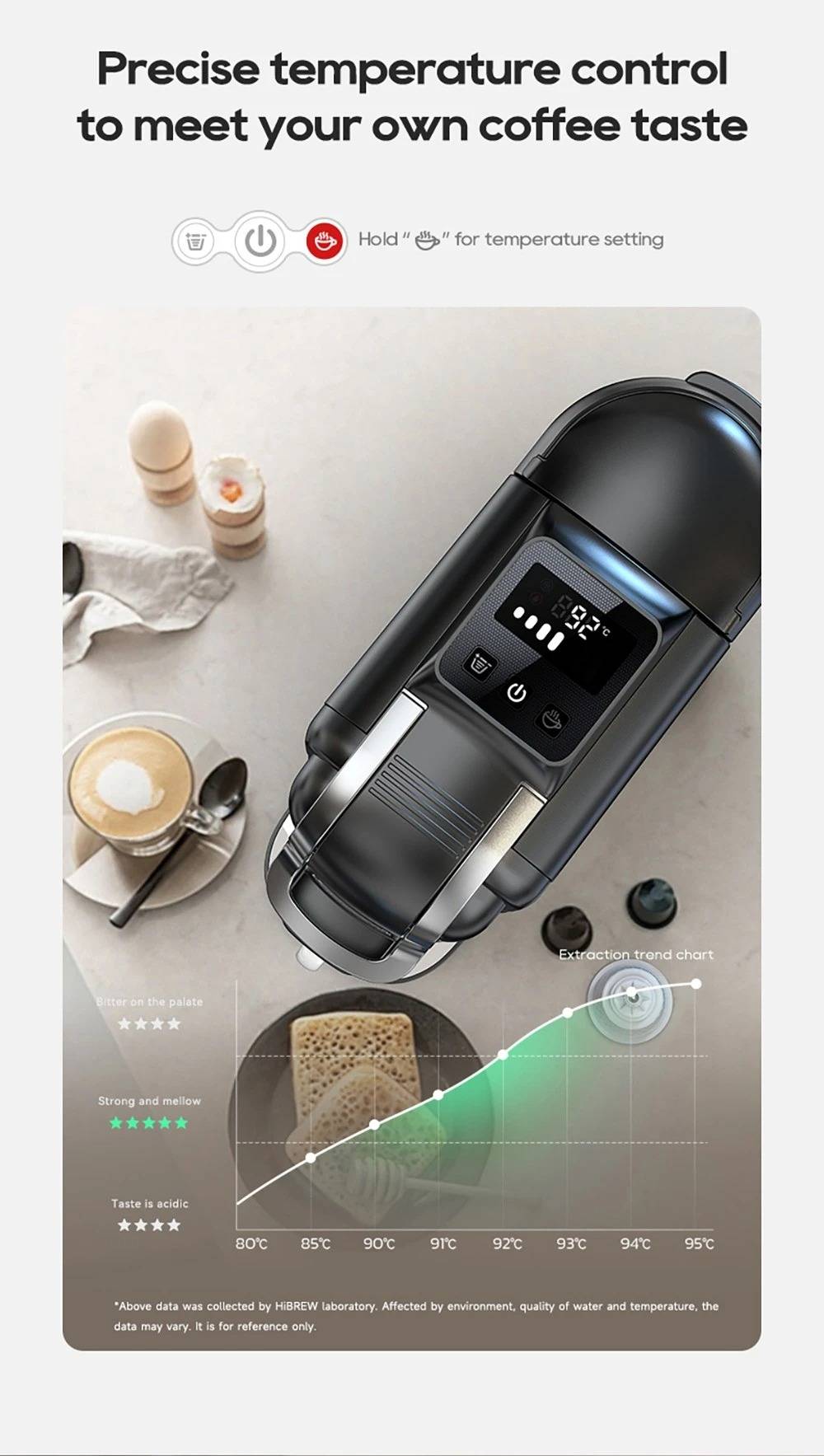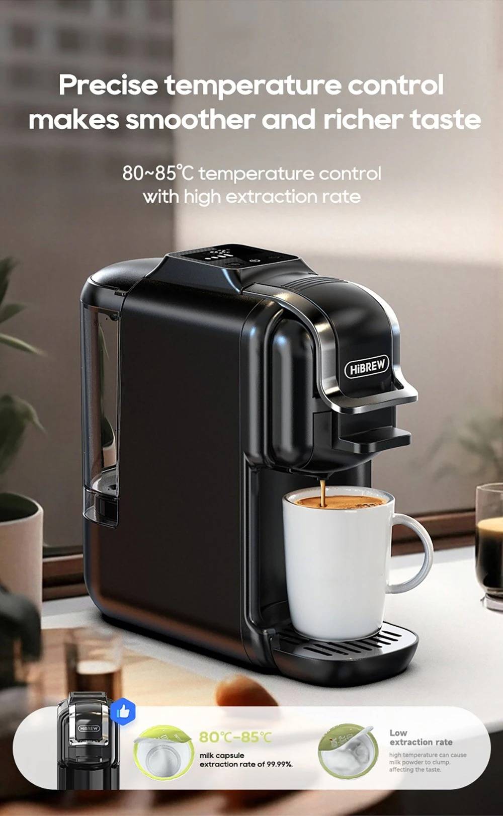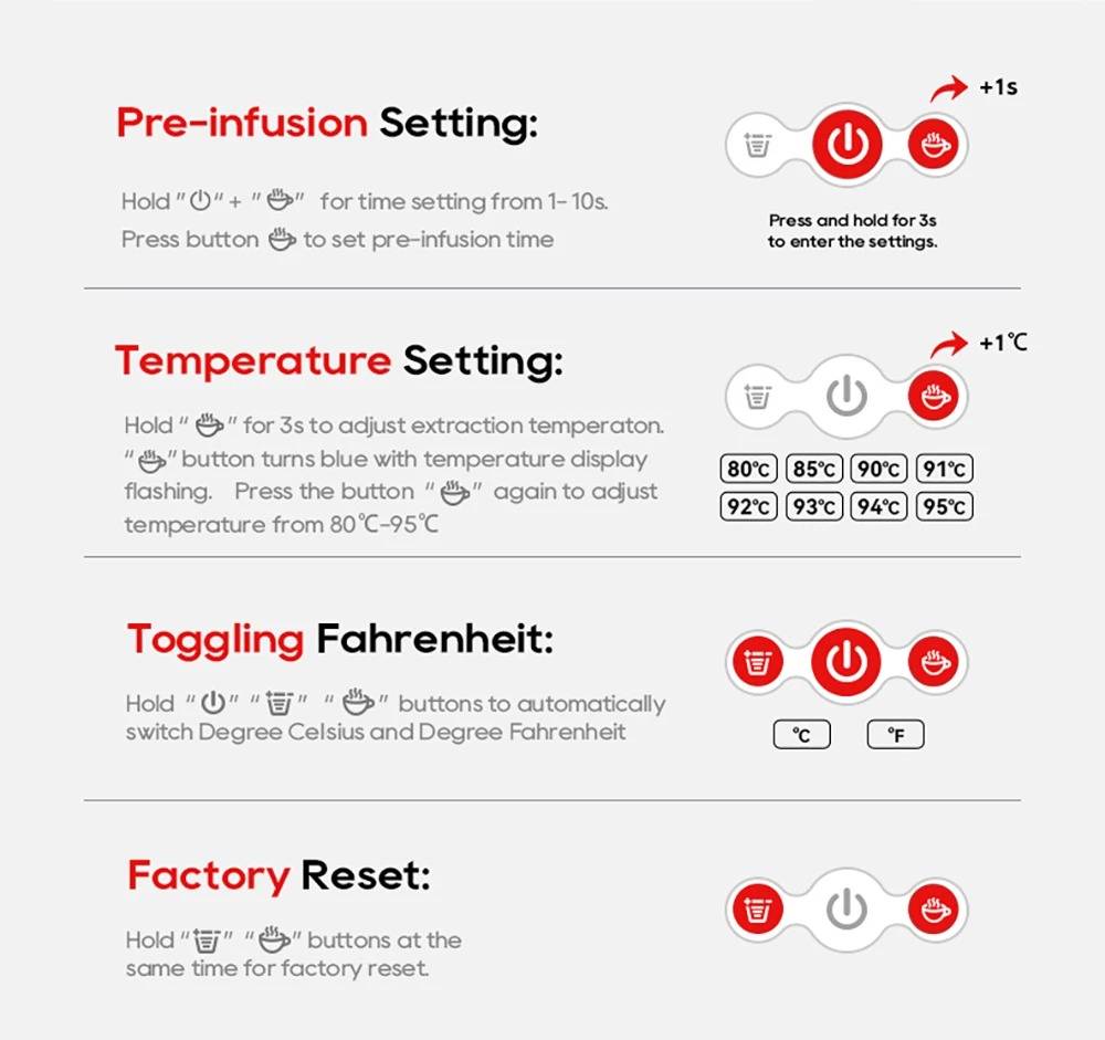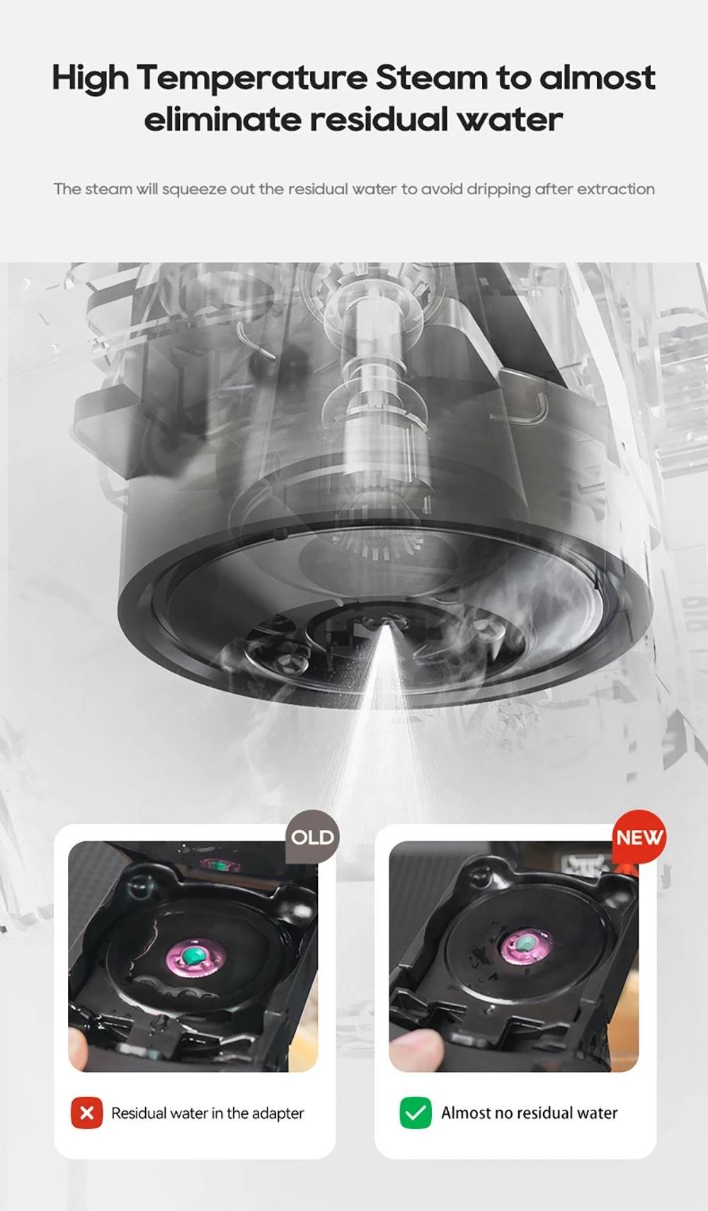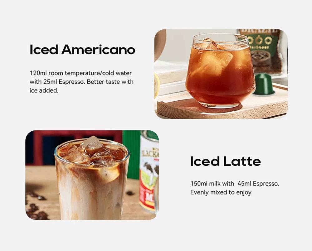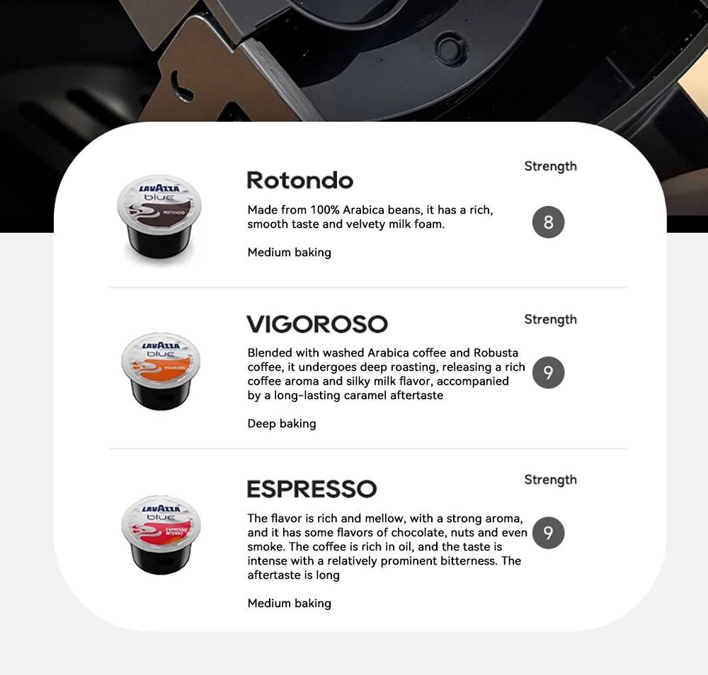 New Touchscreen Display: Simple and intuitive to operate. 7 Adjustable Water Levels: Precisely control water volume and customize coffee strength. High-Temperature Steam Drying Technology: After extraction, the capsule is dried to remove almost all residual water. The steam process expels remaining water to prevent dripping. Hot & Cold Coffee with Multi-Level Temperature Control: Adjustable settings for precise brewing, delivering a smoother and richer taste. Optimal extraction at 80–85 °C for high efficiency. Electromagnetic Valve Pressure Release: At the end of brewing, the valve automatically releases pressure so the handle can be opened effortlessly. Low-Pressure Pre-Infusion: Programmable pre-brewing time ensures the coffee grounds are evenly moistened before full extraction. Wide Capsule Compatibility: Supports DG large capsules, Nespresso capsules, Lavazza capsules, ground coffee, and ESE PODs.