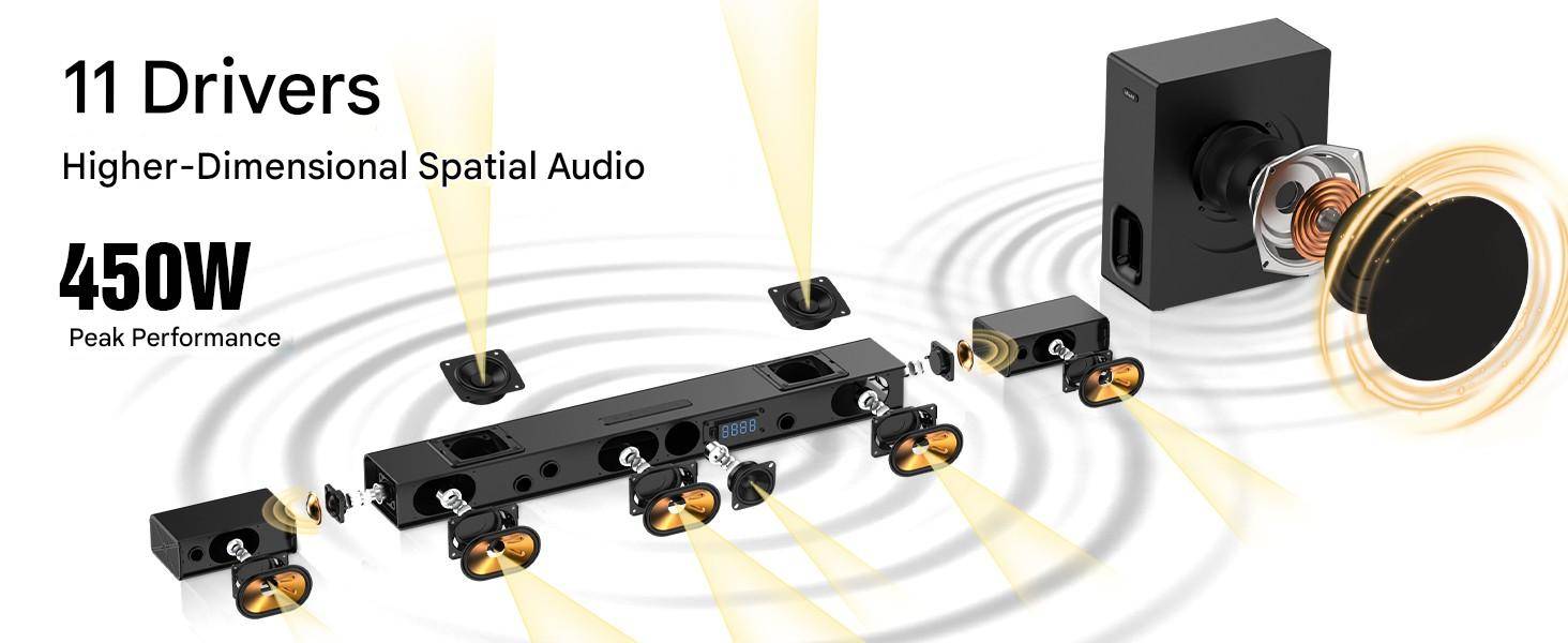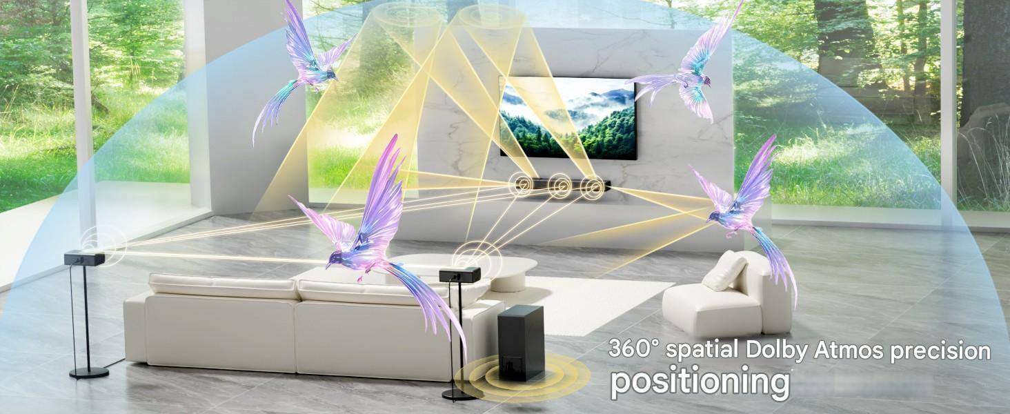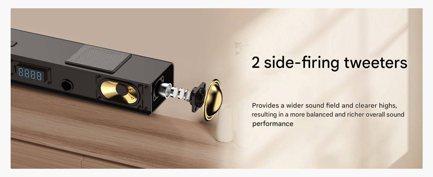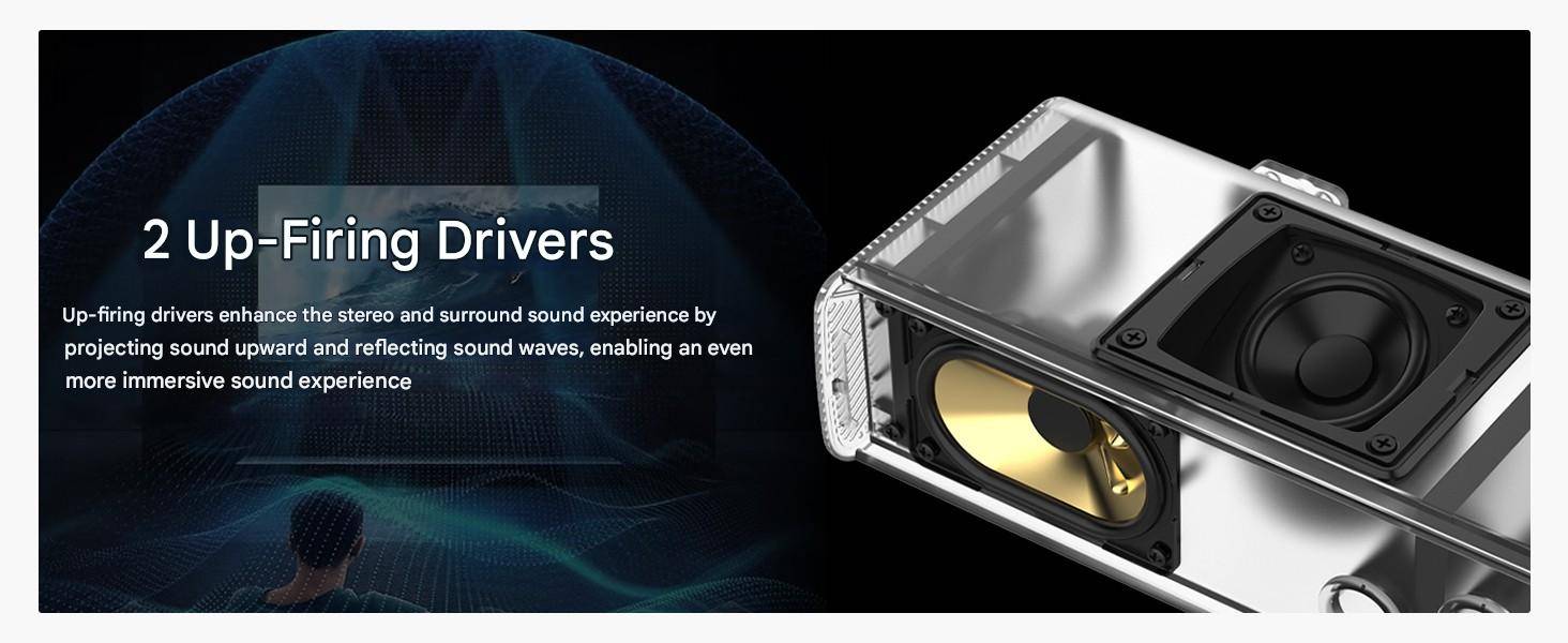 while the proprietary two side-firing and two upward-firing drivers enhance precise horizontal and vertical sound placement for an all-encompassing sound experience.