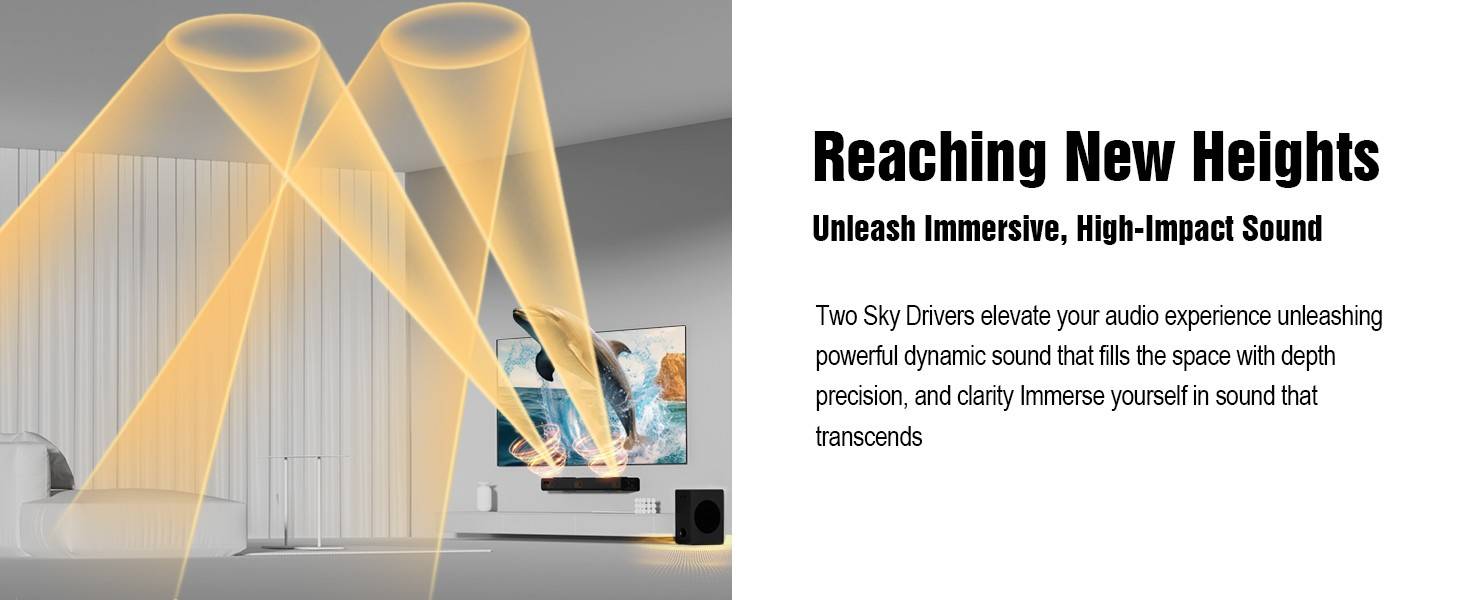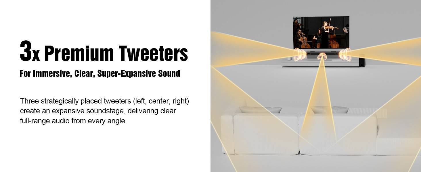 Unlike standard 3.1.2CH systems, our advanced soundbar features 2 exclusive side tweeters and a dedicated center tweeter, expanding the soundstage for richer, more immersive experience. The additional tweeters enhance clarity, while precise overhead effects & deep bass bring cinematic audio to life