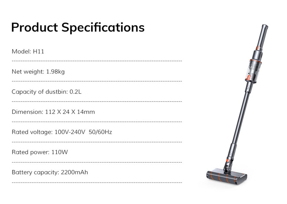 | Motor: Brushless Number of Filter Layers: 3 Main Filtration Method: high-efficiency filter Dust Cup Volume (L): 0.2 Dust Cup Removable: yes Dust Full Indication: No Battery Capacity: 2200mAh Fully Charged Time (h): ≤5 Battery Life (cycles): 300 Battery Display: Yes Smart Display: None Voice Prompt: None Noise: ≤78dB @1.5m Vacuum Degree: high-grade 16kpa, low-grade 8kpa Endurance Time: high-end 15min, low-end 30min Floor Brush: Double lint roller brush Rated Speed: 1000-14000rpm Motor Life: 150h Rated Voltage (V): 14.8 Actual Power (W): 15 Floor Brush Removable: Yes Floor Brush Lighting: No Motor Overcurrent Protection: high/low Main Motor: Rated Speed: 80000rpm Motor Life (h): 500 Rated Voltage (V): 14.8 Actual Power (W): 110 Adapter: Rated Input Voltage (V): 100-240 Rated Input Frequency (Hz): 50/60 Rated Input Current (A): 0.3 Rated Output Voltage (V): 18 Rated Output Current (mA): 500  |