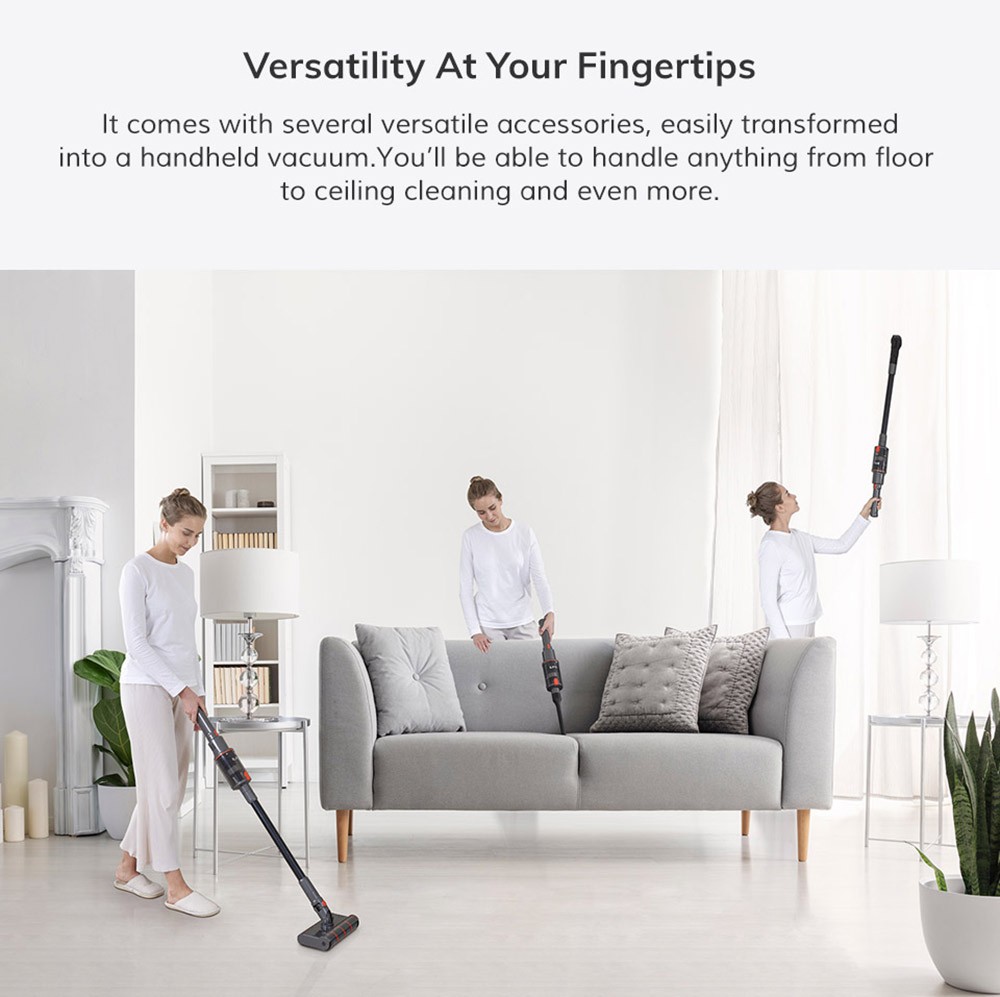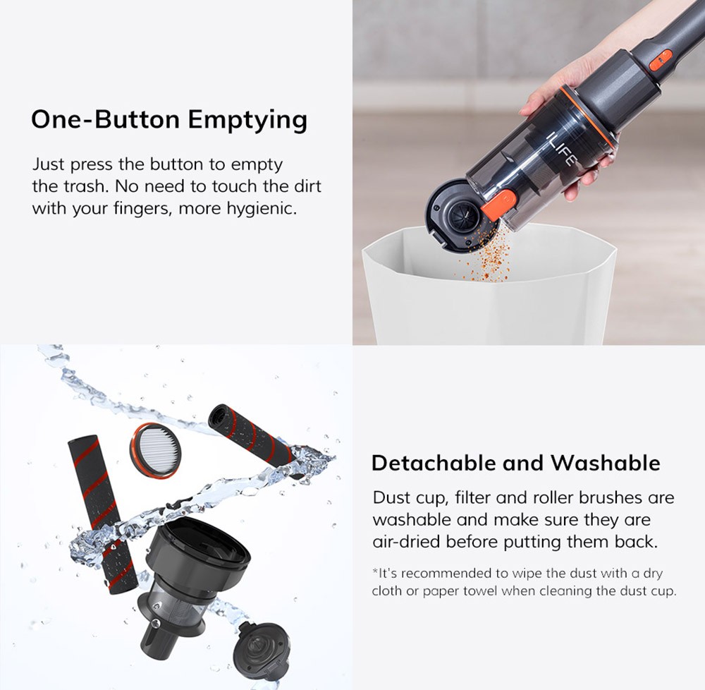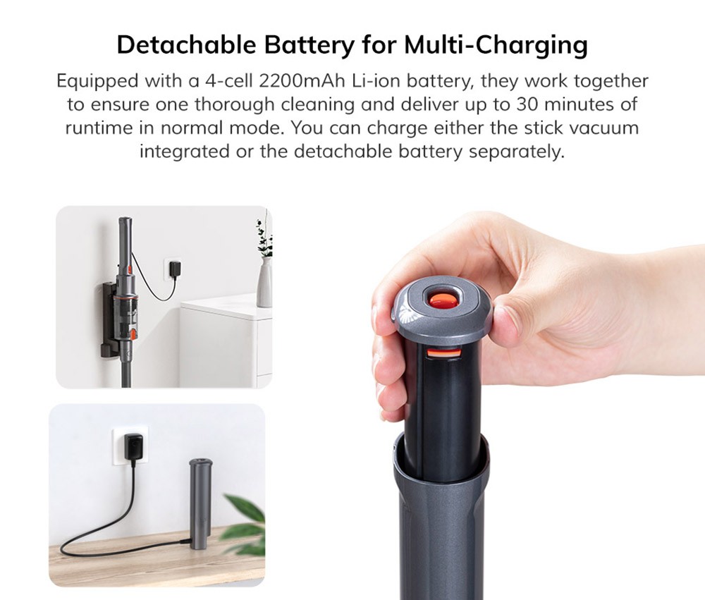 Equipped with a 4-cell 2200mAh Li-ion battery, they work together to ensure one thorough cleaning and deliver up to 30 minutes of runtime in normal mode. You can charge either the stick vacuum integrated or the detachable battery separately.
