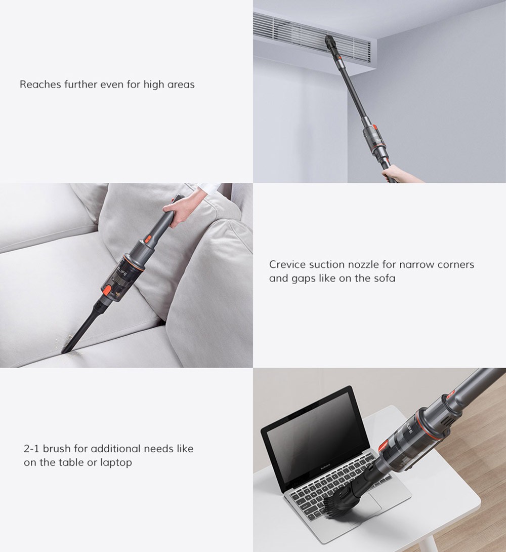 It comes with several versatile accessories, easily transformed into a handheld vacuum. Crevice suction nozzle for narrow corners and gaps like on the sofa. 2-in-1 brush for additional needs like on the table or laptop.