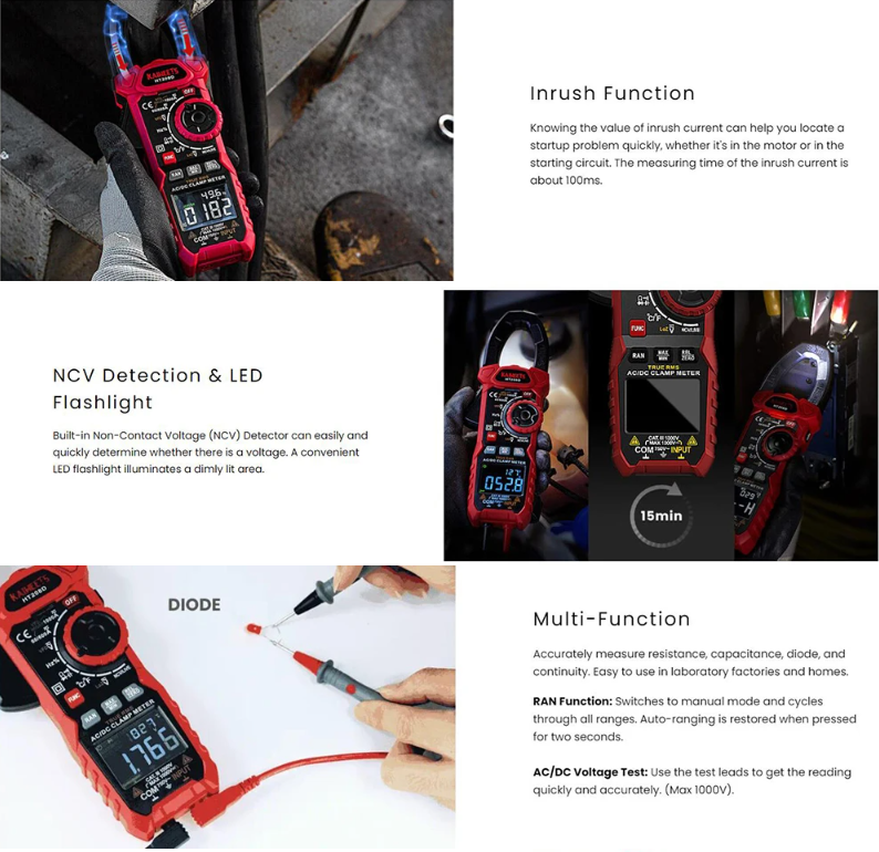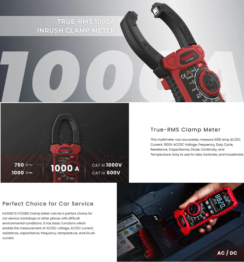 KAIWEETS HT208D INRUSH Clamp Meter, 1000 Amp AC/DC Current, 1000V AC/DC Voltage, NCV sensor, GFCI electrical outlets tester