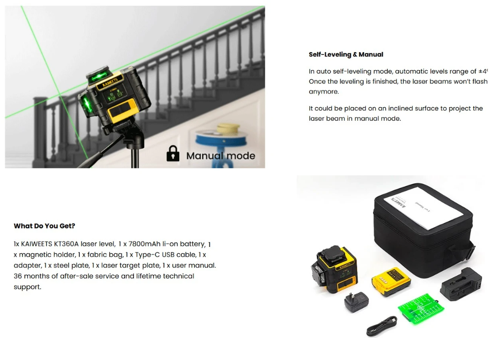 KAIWEETS KT360A Self Leveling Laser Level, 3 X 360, 3D laser level for Picture Hanging, Horizontal/Vertical Line Laser