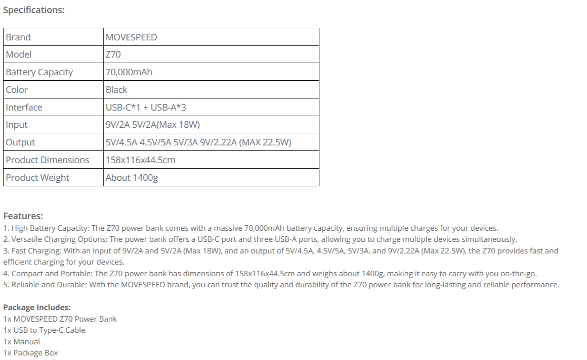 MOVESPEED Z70 22.5W 70000mAh Power Bank External Battery Power Supply with 1 Input & 4 Outputs PD3.0 QC3.0 Fast Charging for iPhone 15 14 13 for Xiaomi 14pro for Samsung Galaxy S24 for Huawei Mate60 Pro