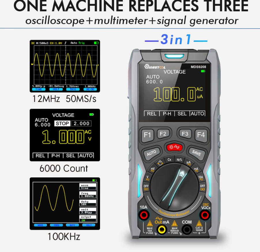MUSTOOL MDS9208 3In1 Oscilloscope Multimeter Signal Generator 12MHz 50Msps Portable High Storage Capacity Low Power Consumption - MDS9208(EU stock)$61.49