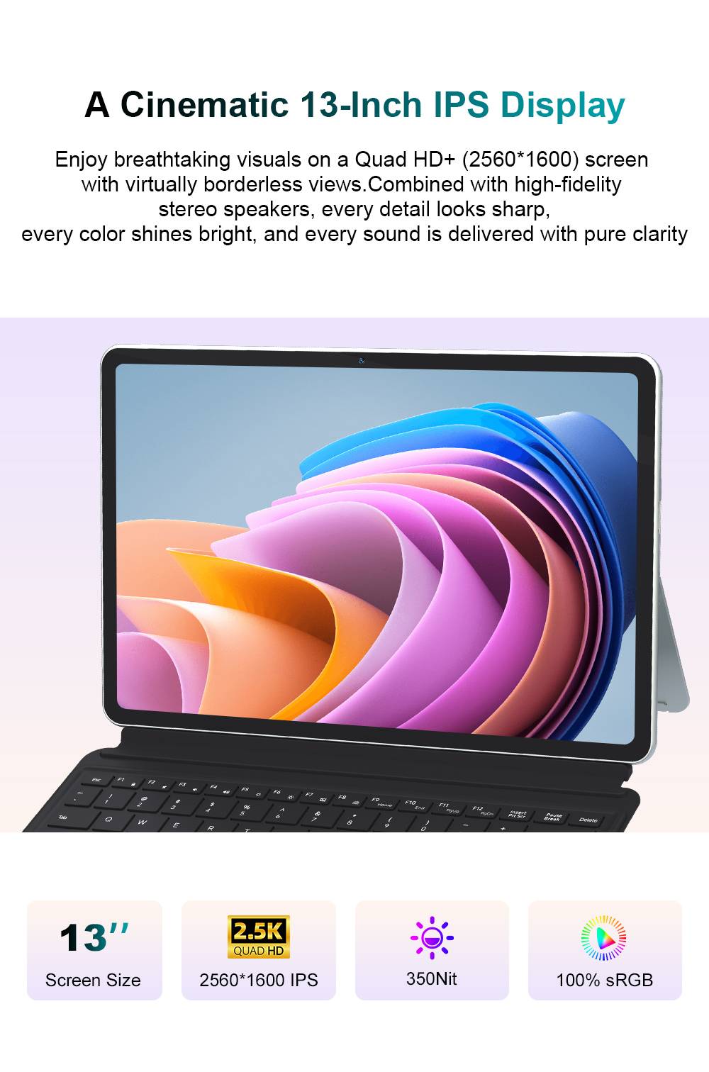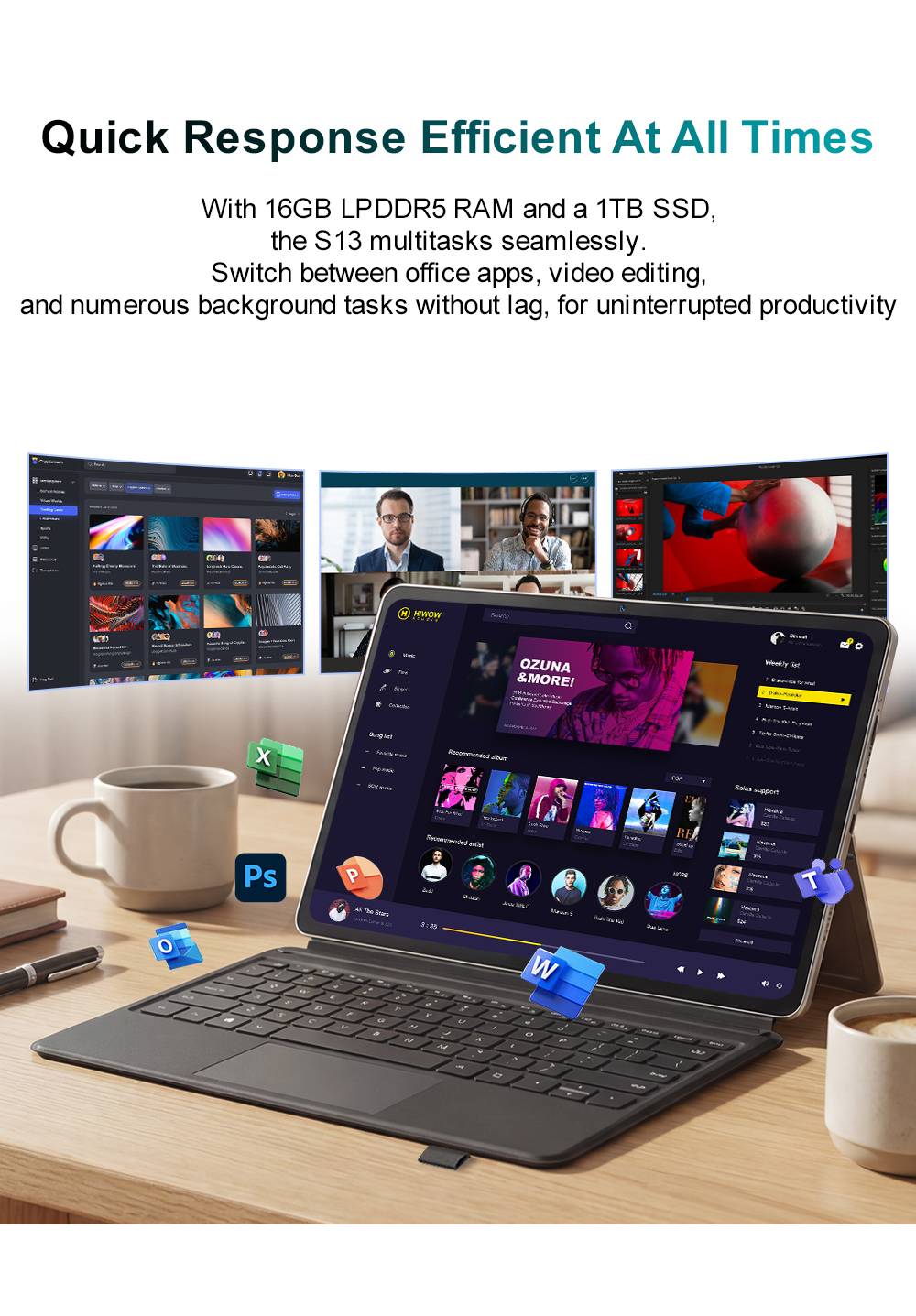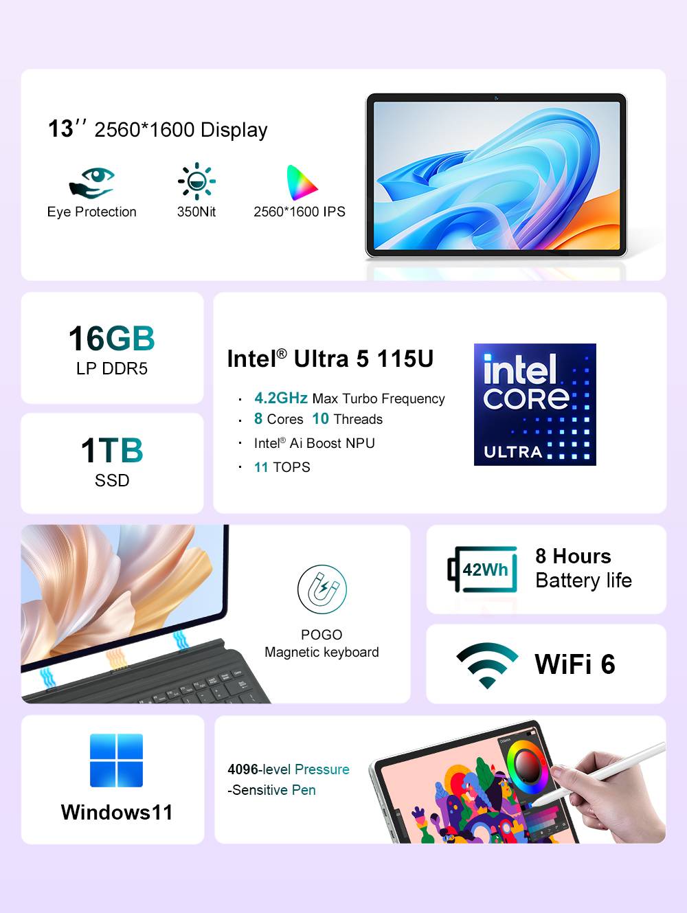 ModelNinkear:S13 CPU:Intel Core Ultra 5 115U GPU:Intel Graphics Core:8 Cores10 Threads, up to 4.2GHz System:Windows 11 Language:Multi-language RAM:16GB DDR5 ROM :1TB SSD Screen:13 Inch IPS Screen,16:10 Resolution:2560*1600 Camera:Front is 5.0MP Rear is 5.0MP Battery:11.67V/3600mAh (42Wh) Keyboard :EU Direct: QWERTY (American layout) Weight:850g Size:300.57*195.56*9.89mm