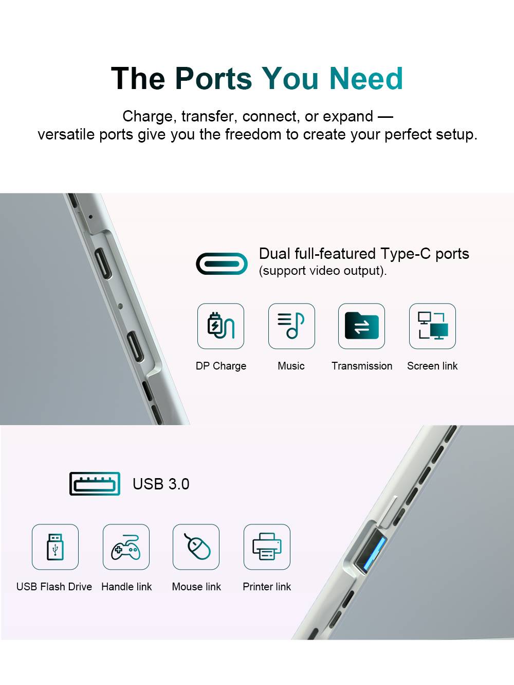 WIFI:WIFI 6.0,IEEE 802.11ax Bluetooth:5.2 OTG:Support GPS:Not Support NFC:Not Support G-sensor:Support 4G:Not Support Frequency:NO Microphone :Built-in Speaker:Built-in Audio:AAC,AMR,MP3,OGG,WAV,ACC,M4A,FLAC Picture:JPEG,GIF,BMP,PNG,JPG Video:3GP,AVI,MKV,MP4,M4V,WEBM,MPEG4 I/O Port:2 x USB3.2 Gen1 Fullfunction (PD/DP/Charge/Data) 1 x USB3.2 Gen1
