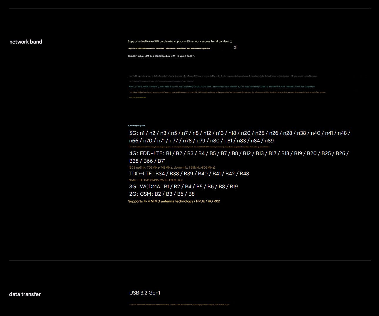 Note: Actual network and band usage depends on local carrier deployment. n3 / n80 / n81 / n89 bands require software updates after carrier release;