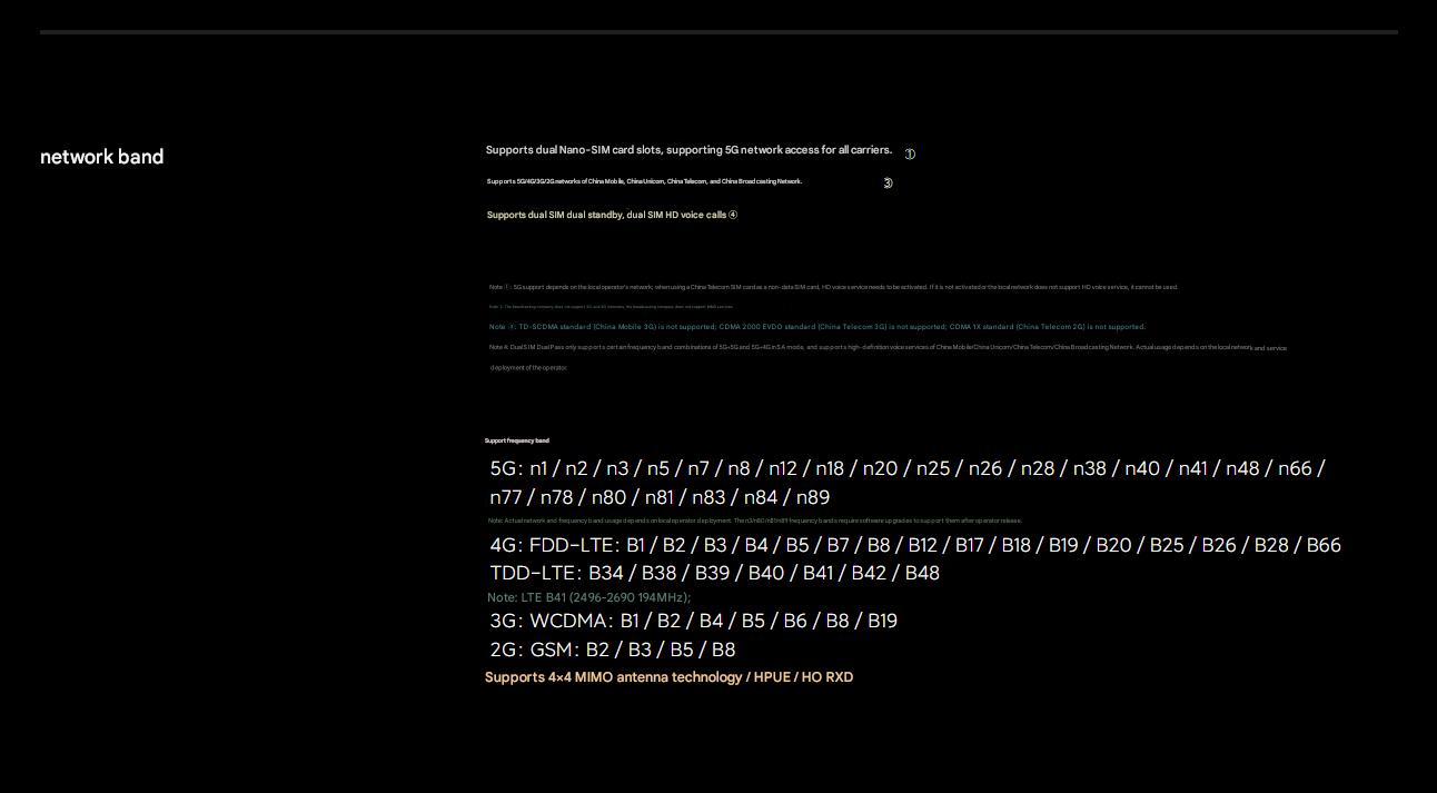 5G:n1 / n2 / n3 / n5 / n7 / n8 / n12 / n18 / n20 / n25 / n26 / n28 / n38 / n40 / n41 / n48 / n66 /n77 / n78 / n80 / n81 / n83 / n84 / n89