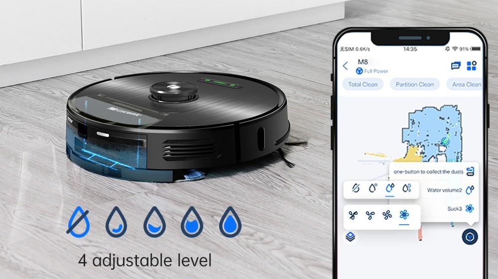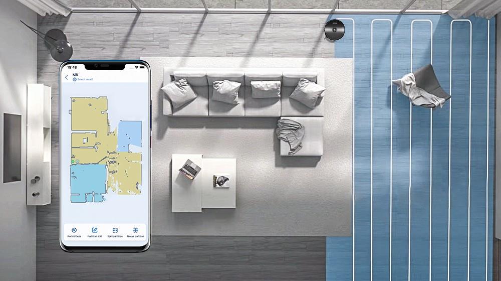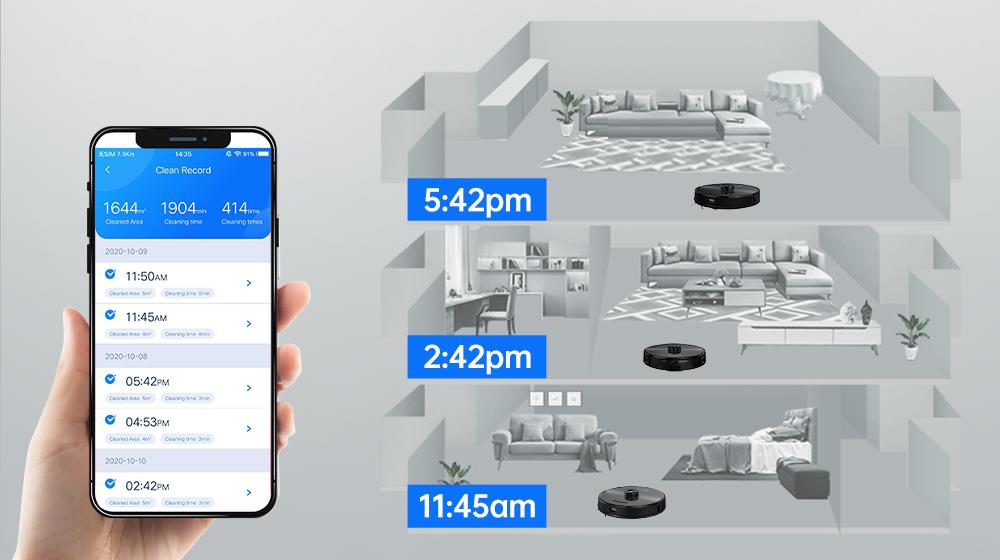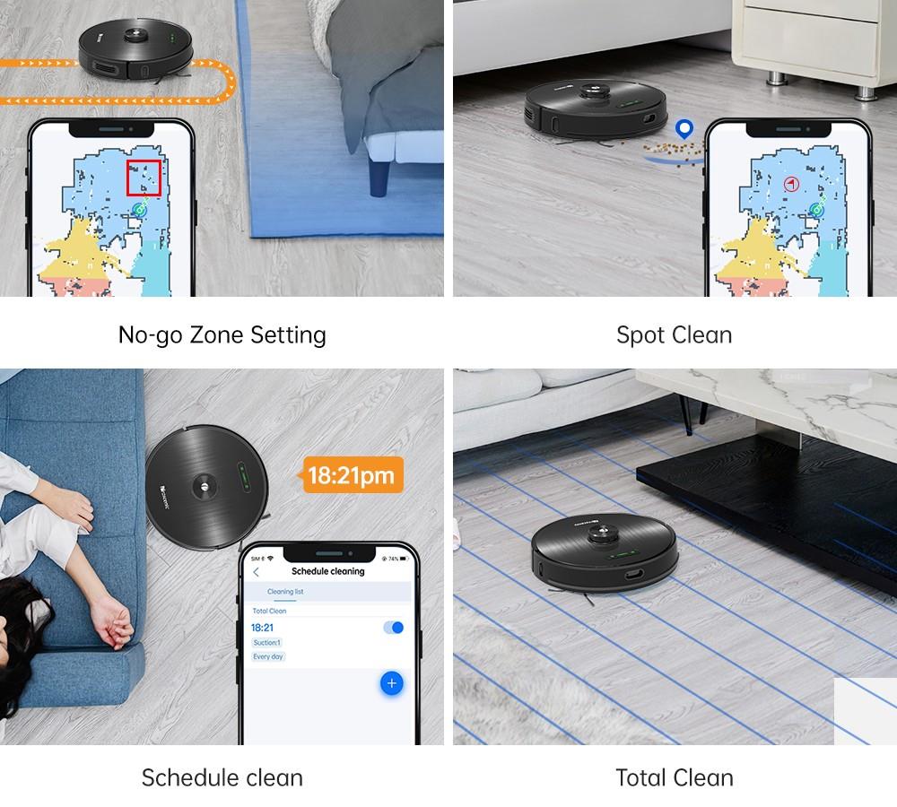 Multiple cleaning modes could be chosen by the app "Proscenic", whole cleaning, customized cleaning, spot cleaning, etc, the different customizable ways for you.