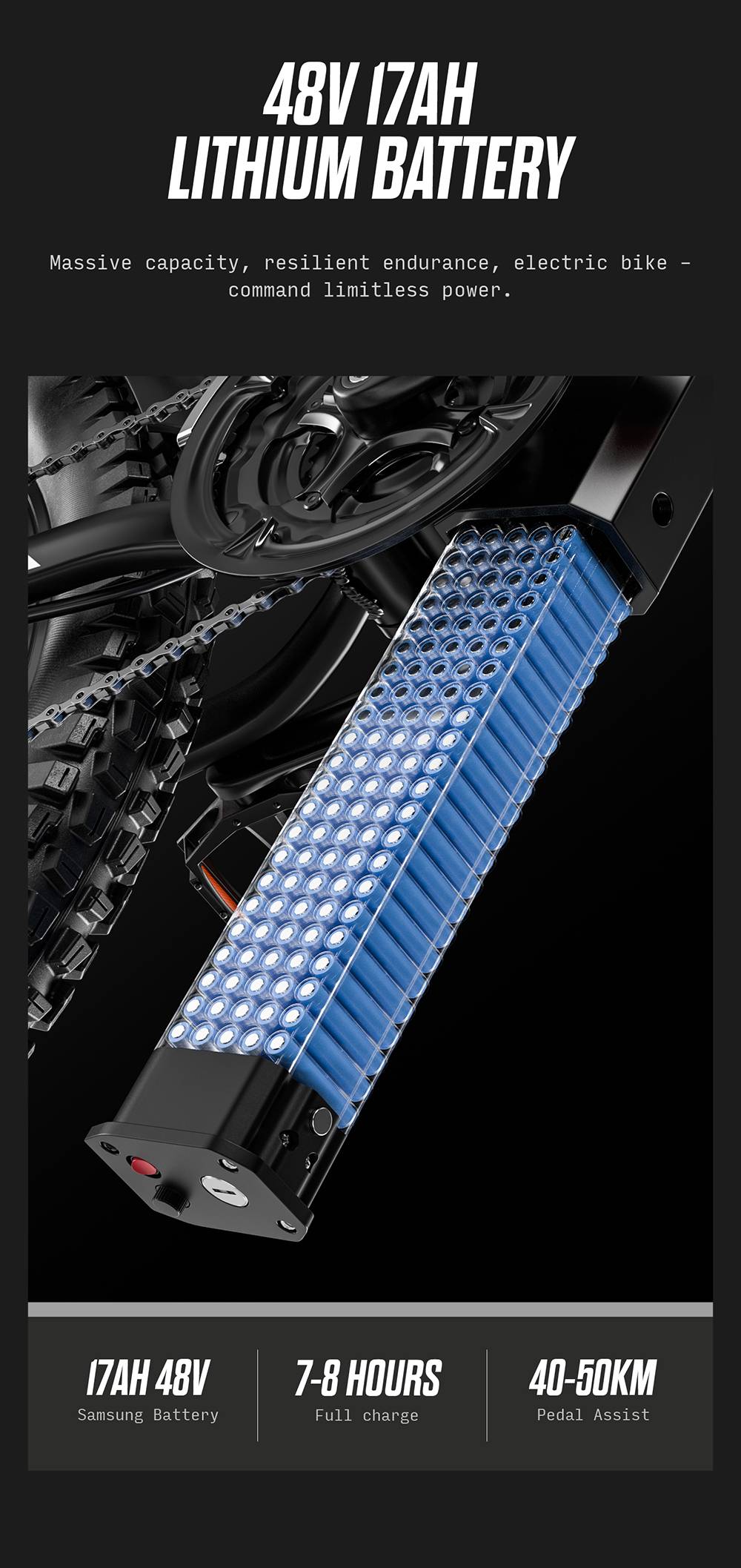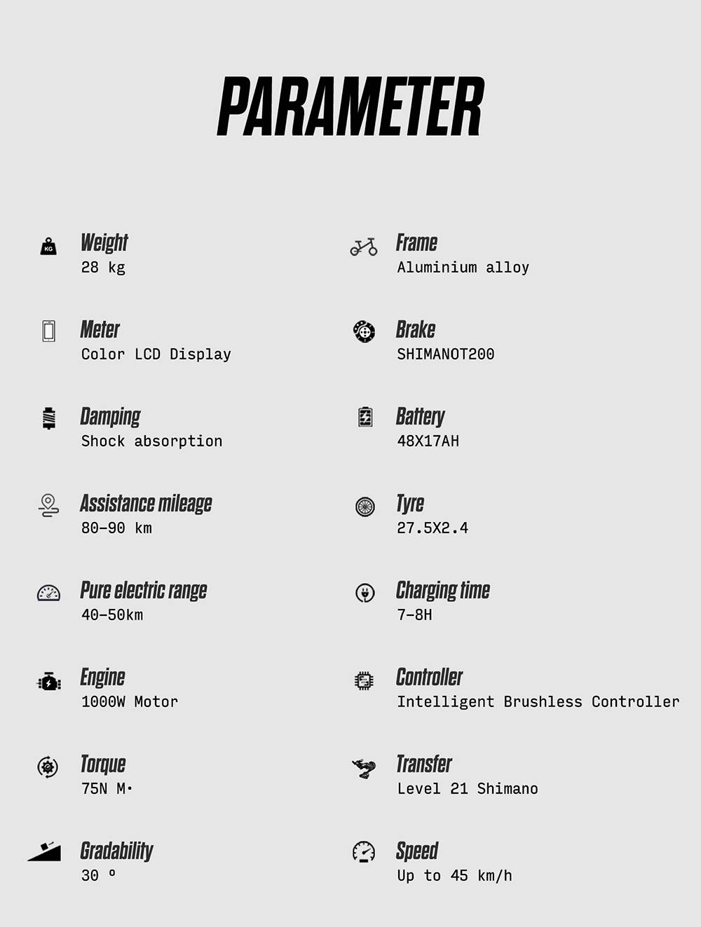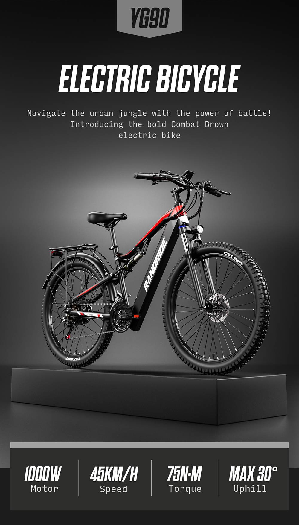RANDRIDE YG90B Electric Bike 1000W Motor 45km/h Max Speed 48V17Ah Removable battery 80-90KM Max Range 27.5*2.4'' CST Tires 120km