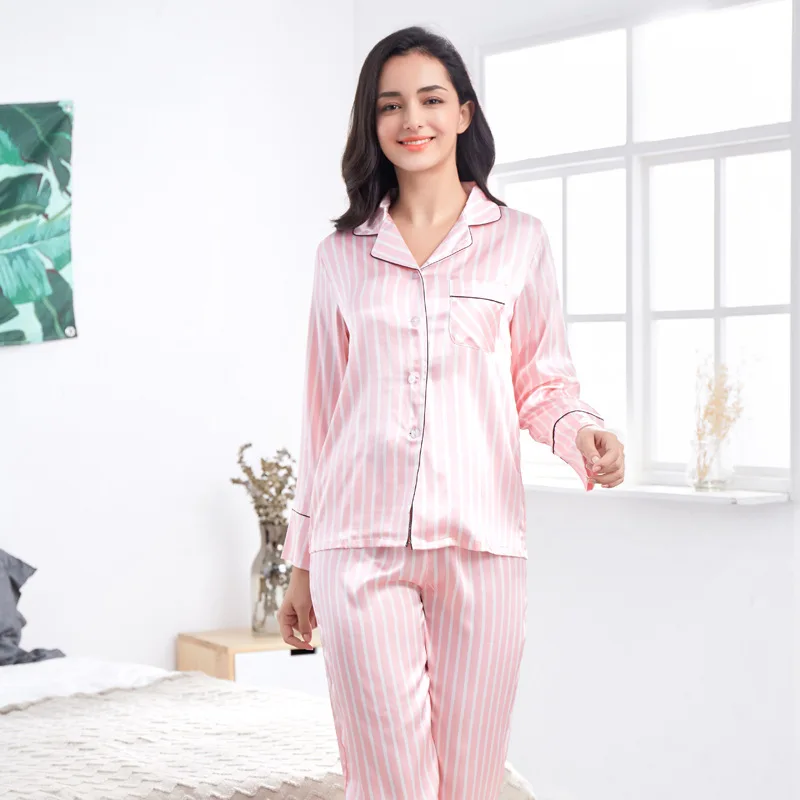 Product Category: Homewear Color: pink stripes Length: trousers Applicable crowd category: Ladies Size: M, L, XL, 1XL, 2XL, 3XL Collar type: Lapel Fabric name: Imitation silk Applicable scene: home Function: leisure, sleep, home, comfort Whether to support OEM: not supported Sleeve length: long sleeve Suitable season: summer, spring, autumn