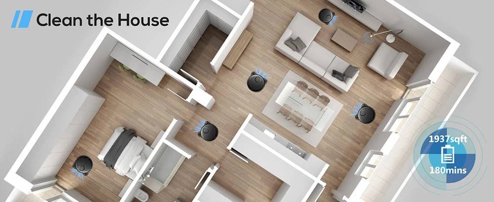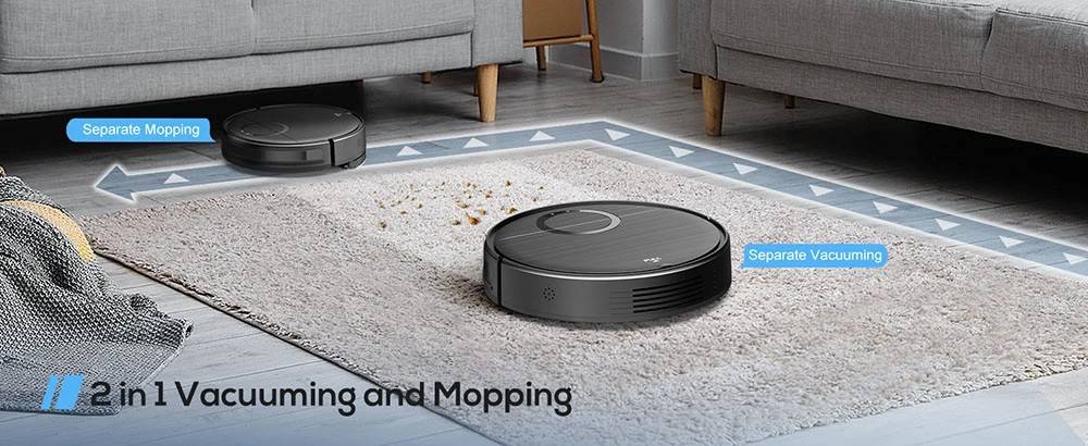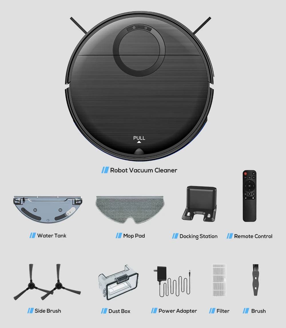 | Package Contents | 1 x Vacuum Cleaner 1 x Remote Control (2 AAA Batteries Included) 1 x Charging Dock 1 x Power Adapter 1 x Water Tank 1 x Dustbin 4 x Side Brushes 1 x Cleaning Brushes 2 x Mop |