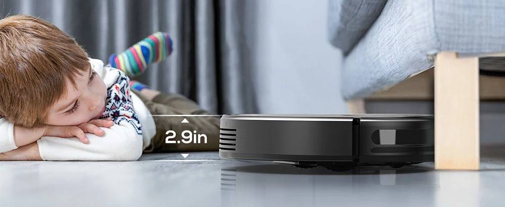 With advanced 3D obstacle avoidance, the robot intelligently identifies and avoids walls, stairs, and obstacles. Its slim 2.87-inch design allows it to reach corners and narrow spaces.