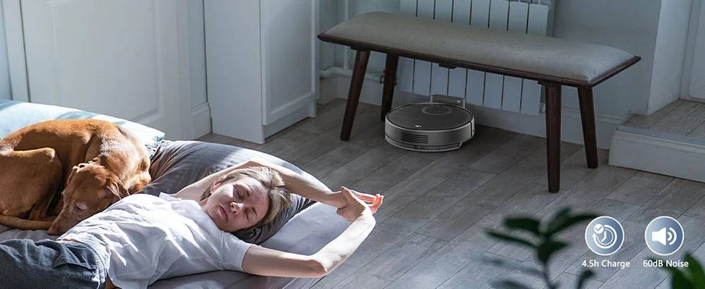 The 2500mAh battery provides 100 minutes of continuous cleaning, with the robot automatically returning to the charging dock when the battery is low.
