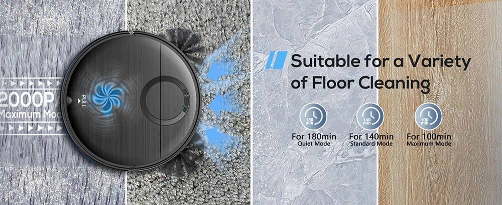 The T7S features a strong 2000Pa suction power and a 230ml electric control water tank, making it suitable for all hard floors, including laminate, ceramic tiles, granite, and parquet.