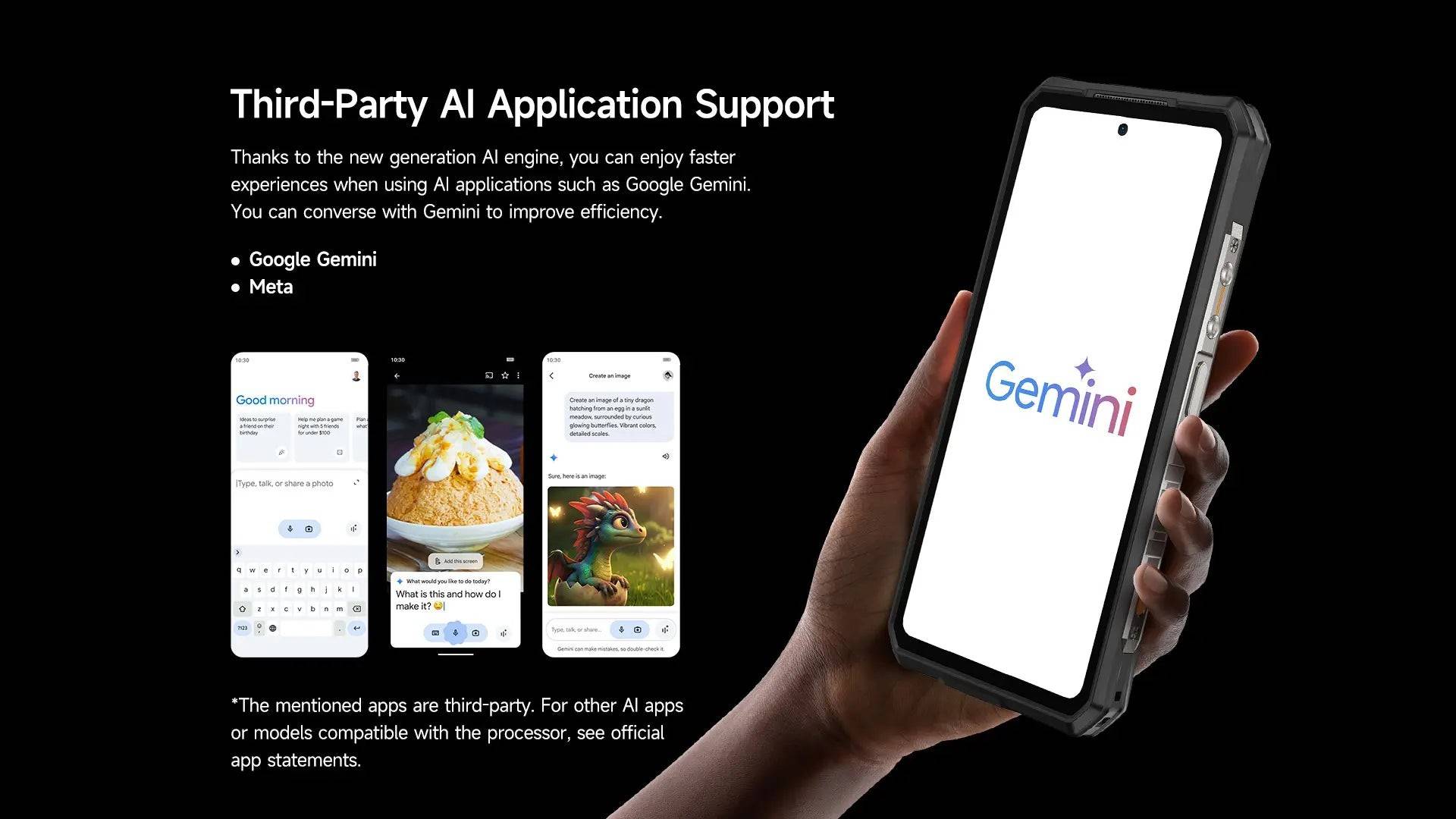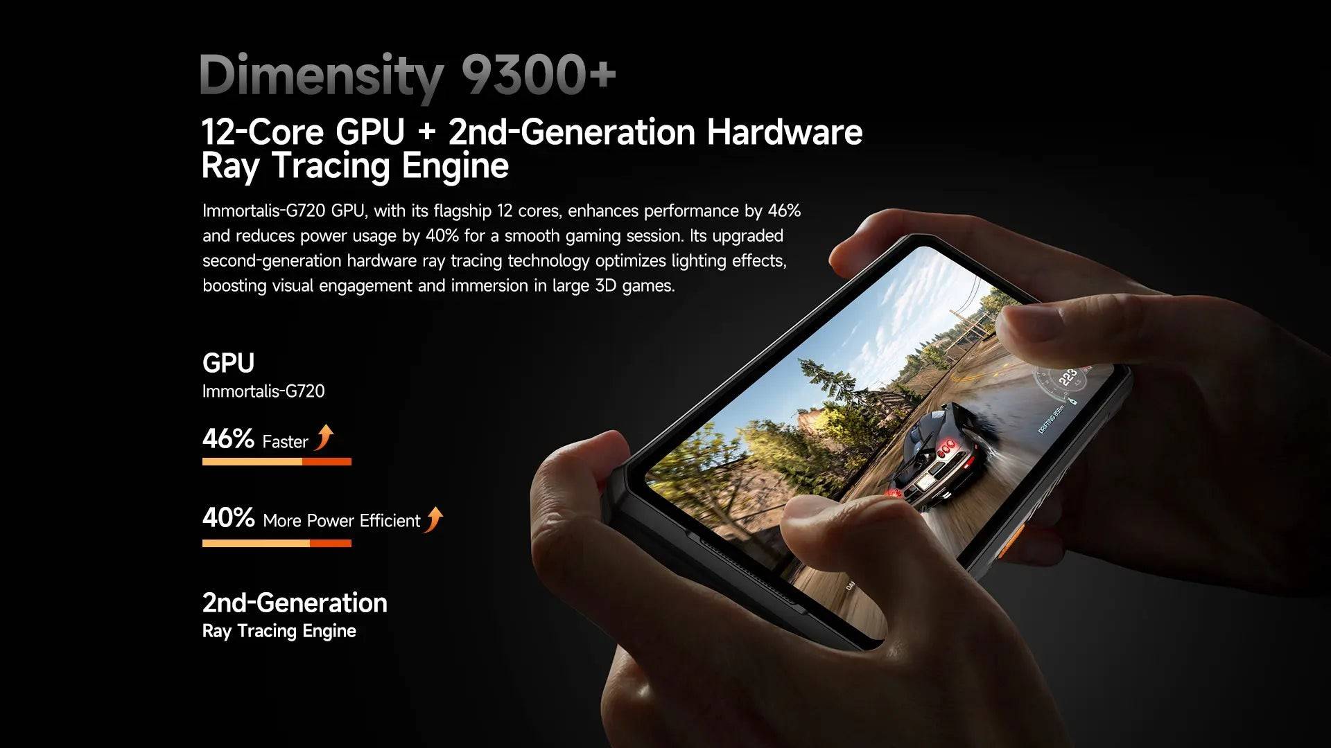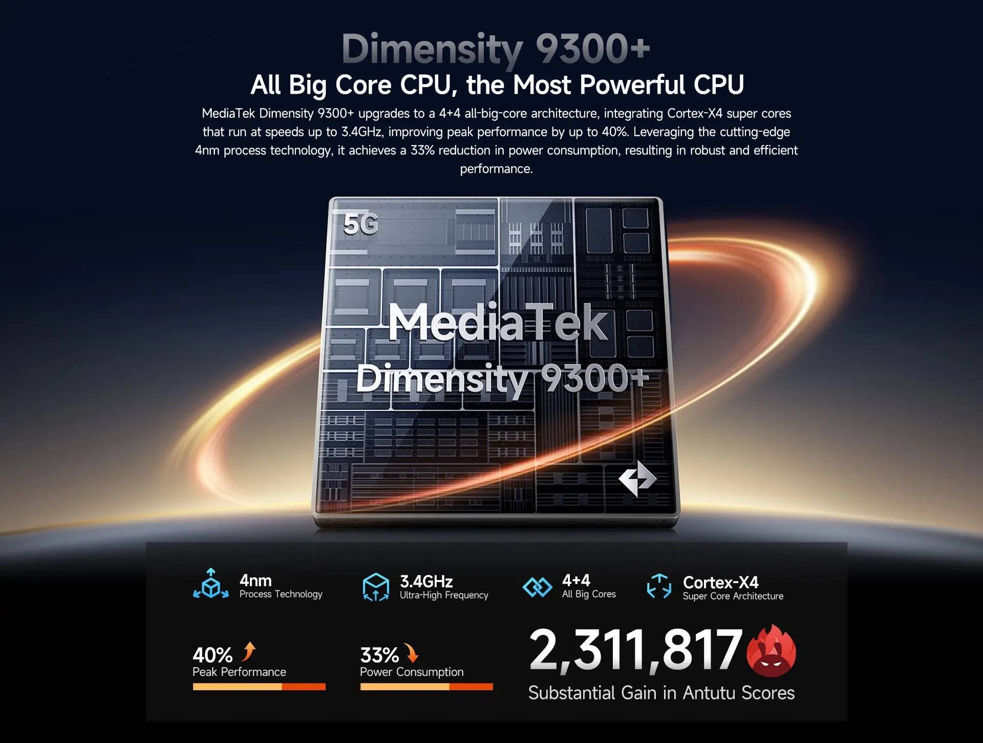 | Hardware | OS: Android 14 (Supports Android 15 update) CPU: MediaTek Dimensity 9300+ (MT6989W) Octa Core, up to 3.4GHz, 1x Arm Cortex-X4 up to 3.4GHz, 3x Arm Cortex-X4 up to 2.85GHz, 4x Arm Cortex-A720 up to 2.0GHz GPU: Immortalis-G720, 1.3GHz AI: MediaTek NPU 790 RAM: 32GB RAM = 16GB LPDDR5X + 16GB virtual RAM (The Virtual Memory Expansion can be activated in Settings and adds up to 16GB of RAM.) ROM: 1TB, UFS 4.0 Card Extend: Supports an external TF card up to 2TB (VFAT) |