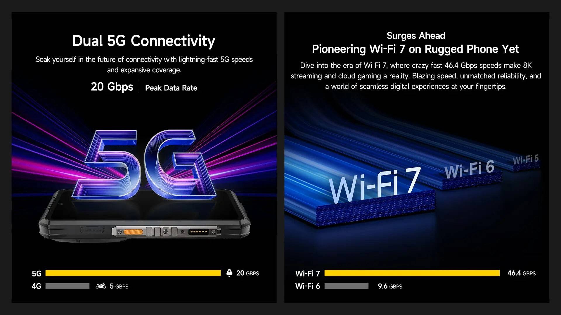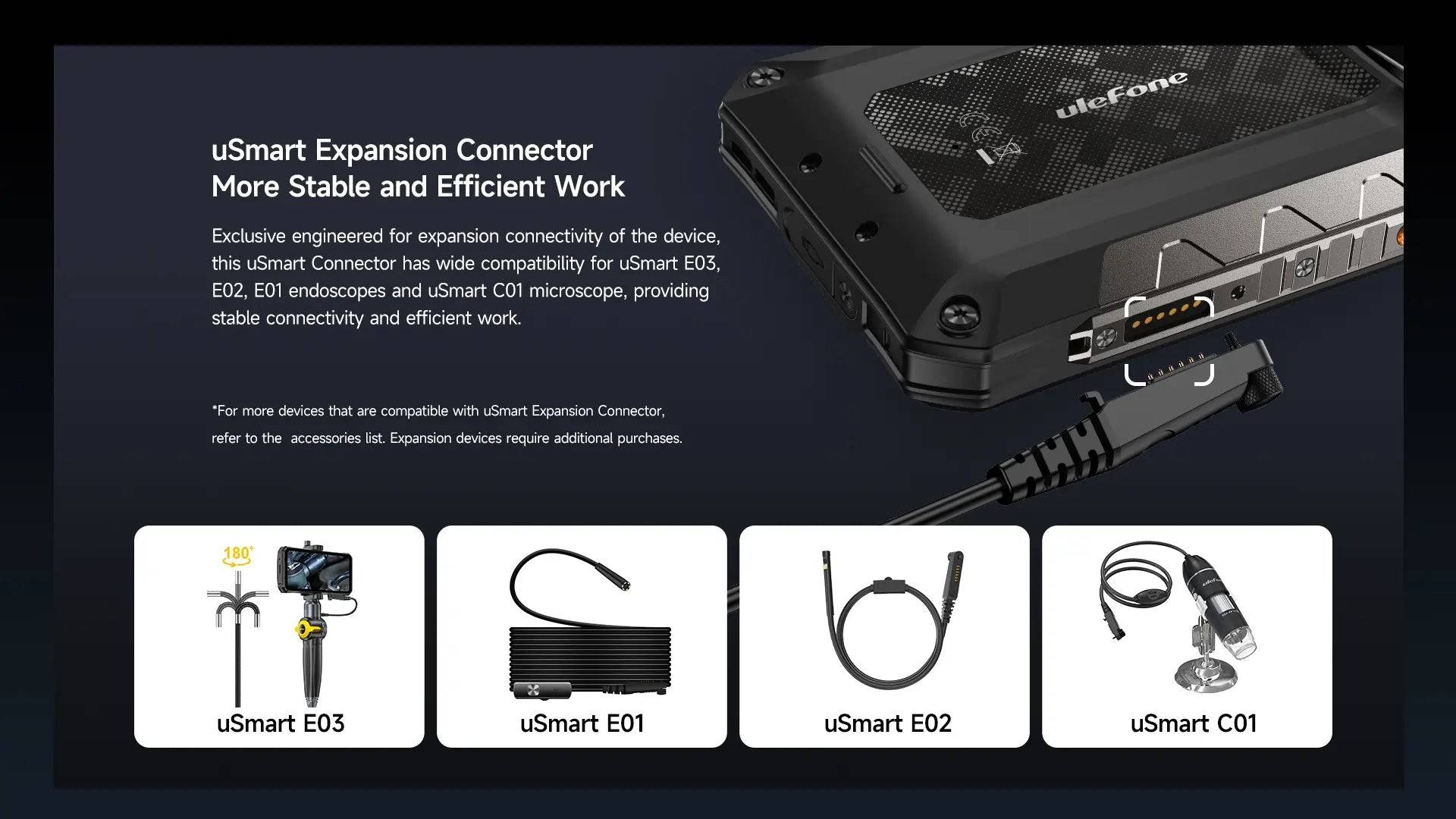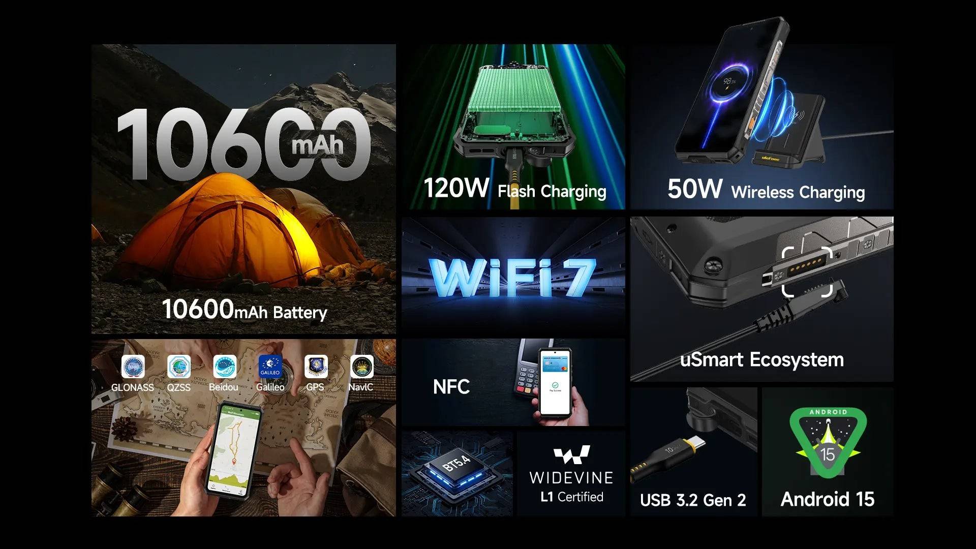 | Other Features | WIFI: 802.11 be/ax/ac/a/b/g/n, WiFi 7 (2.4GHz/5GHz/6GHz) VoLTE: Whether you can use VoLTE depends on the local carriers, because not all of the the local carriers can support this function. bluetooth: BT5.4 Navigation and positioning: GPS, GLONASS, Galileo, QZSS, NavlC GPS, BEIDOU, Digital Compass Material: PC + Aluminium Sensor: Infrared sensor, Proximity Sensor, Gravity sensor, Light Sensor, Acceleration Sensor, Geomagnetic sensor, Gyro sensor, Coulomb counter, Pedometer, Air pressure sensor, Fingerprint, Face Unlock, NFC, OTG FM: Support, headset-free FM radio Cell Broadcast: Yes Headphone Interface: 3.5mm Rugged: Splash, Water and Dust Resistant, Rated IP68 (maximum depth of 2.0 metres up to 30 minutes) under IEC standard 60529, Rated IP69K under IEC standard 60529, MIL-STD-810H Certification Underwater Photography: Yes Smart PA: AW88394 Speaker: 1326 BOX, Max to 2W Notification Light: Yes, red / green / blue, Supports charging prompt uSmart Expansion: uSmart Expansion Connector 2.0, supports uSmart series accessories, allows simultaneous charging via the Type-C port while the uSmart Connector is in use. |